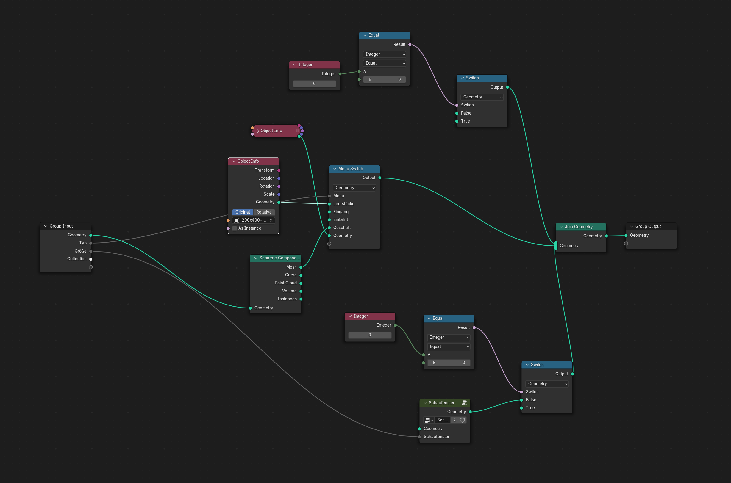 Ich bin noch recht am Anfang, was Geometry Nodes angeht, deswegen erwartet bitte kein Profi-Verständnis. Ziel meiner Nodes ist folgendes: Ich baue gerade ein Baukastensystem für Fassadenelemente. Man wählt ein Element aus, bestimmt als Nächstes den Typ (Tor, Tür, Fenster), dann kontextspezifisch Unterkategorien wie Größe, Variante usw.