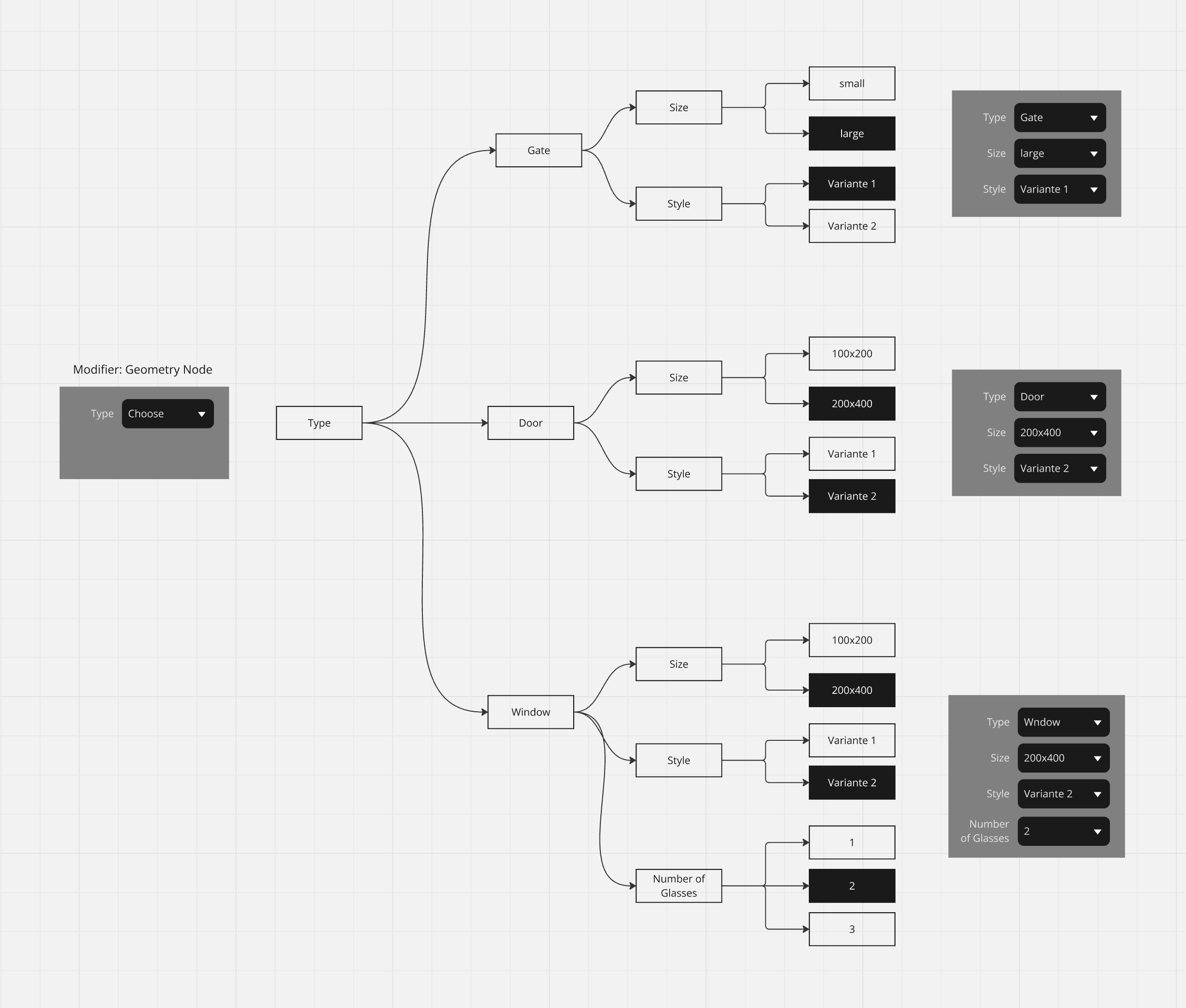 Wie man sieht, möchte ich z.B. Typ > Tür > "Größe = 200x400" und "Stil = Variante 1" auswählen.
