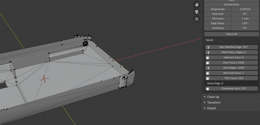 Habe auch "merge by distance" probiert, und die Autoreparatur ist leider auch nicht zielführend, und in einer Ecke, da wo das Loch durch die Seitenwand führt, sind nicht nur die "Faces" verkehrt, sondern es sieht so aus, als würde da eine (kleine) Face in der Ecke komplett fehlen, aber ich bekomme das nicht geschlossen. Es ist zum Haare raufen, ich sitz da schon den ganzen Tag dran, und komme nicht weiter