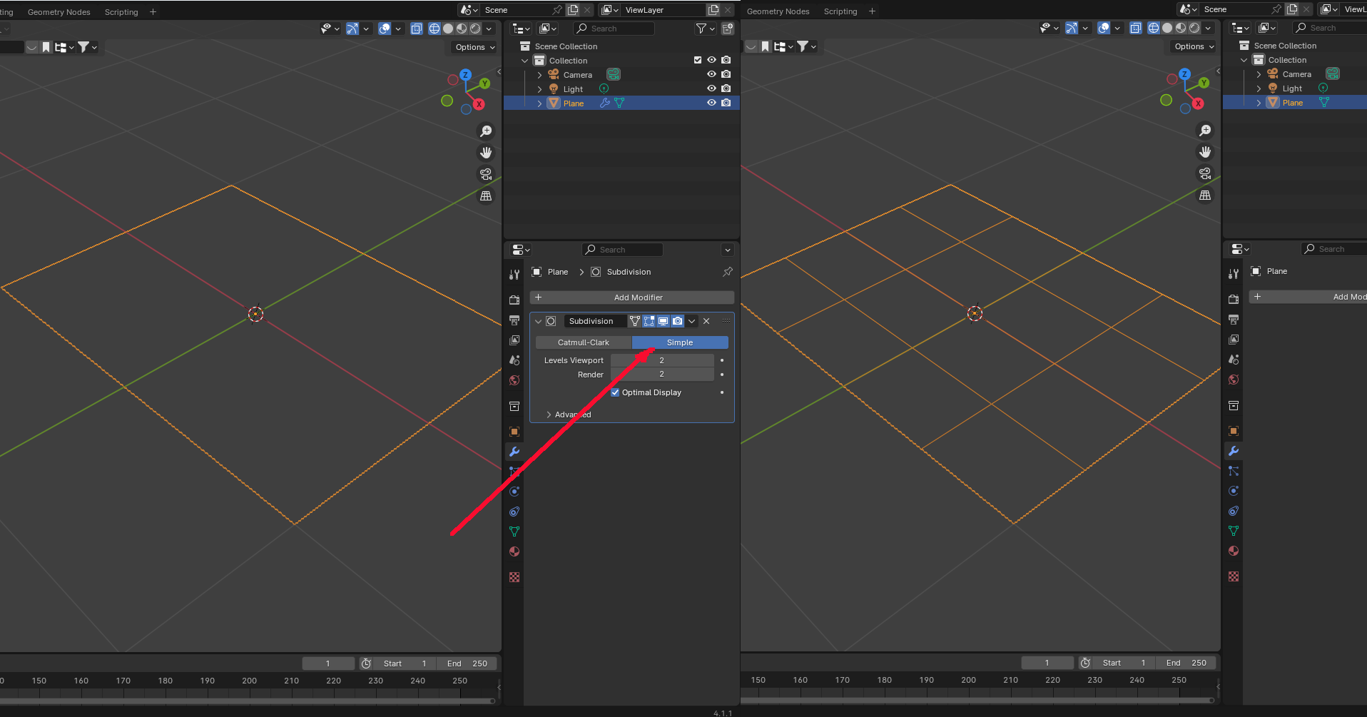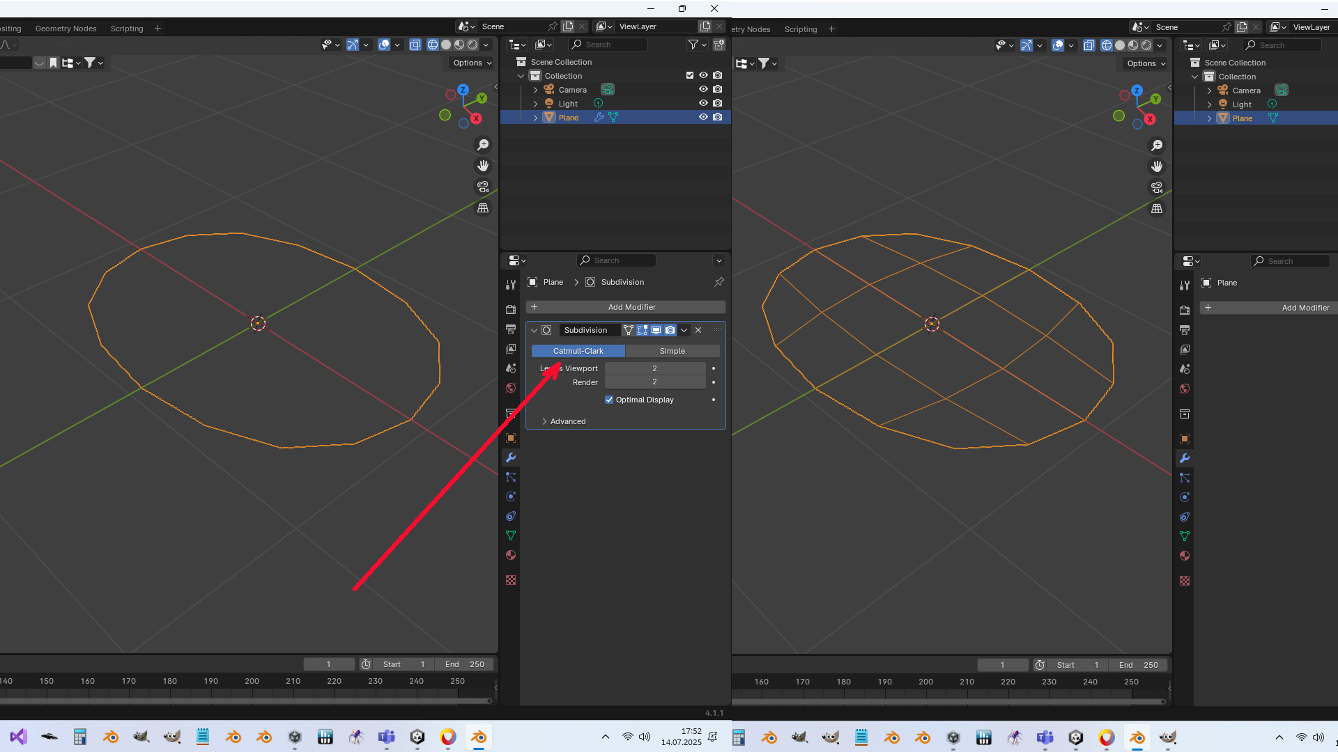 RE: subdivision - OldArjey - 14.07.2025 Ja, danke. Aber das müsste auch über den modifier gehen - Schraubenschlüssel rechts: Add Modifier, oder STRG + 1 - aber da verändert es die Aussenkontur, nicht den Inhalt (zb einer Ebene). Ging mE auch mal... und geht auch so in dem Tutorial, das ich mir gerade reingezogen habe :-( RE: subdivision - Malthea - 14.07.2025 Hallo, im Modifier-Panel "Simple" aktivieren - das sollte dein Problem lösen. Grüße Malthea RE: subdivision - OldArjey - 14.07.2025 Nö, tut es nicht :-( Im Video steht es übrigens auf Catmull-Clark. Das Video ist von Lichtspieler und heißt "Stoffe animieren" - verwendet wird da allerdings Blender 3.4. Ich benutze Blender 4.4.3 Nichts desto trotz meine ich, dass es bei mir früher mit dem Modifier funktioniert hat. RE: subdivision - Malthea - 14.07.2025 Aus deinem Eingangspost geht hervor, dass du eine Fläche unterteilen willst - und zwar ohne Rundung der Aussenkante. Auf den Screens eine einfache Plane mit dem Subdivision Surface. Im linken Teil die Einstellung des Subdivision Surface mit Catmull Clark - im rechten Teil das Ergebnis nach apply Im linken Teil die Einstellung des Subdivision Surface mit Simple - im rechten Teil das Ergebnis nach apply Im blender 4.1 gibt es keinen Slider, aber das Ergebnis mit der Simple-Einstellung passt zu deinen Vorgaben. |