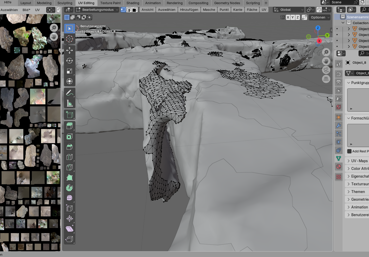 Überlappende Wände ausbessern oder zusammenführen - vnv-urbex - 06.08.2025 Hallo, ich versuche mich gerade mit Blender und habe ein paar Fragen. Alle Anleitungen auf Youtube handeln bisher von Kreisen und Würfeln. Ich selbst benutze Polycam zum Scannen von zum Beispiel Luftschutzstollen. Siehe hier Nun sind diese ja keine Würfel und ich finde einfach nicht die passenden Anleitungen. Bei dem Scan möchte ich ein paar Sachen ausbessern, als Beispiel wäre da diese Stelle. Dort hat sich eine doppelte Wand eingeschlichen, da sich der Scan dort überlappt. Das passiert mir leider öfter mal, ich schätze, es liegt an den doch relativ großen Räumen die ich Scanne und an manchen Stellen doppelt vorbeikomme. Vielleicht mache ich da auch noch etwas falsch und muss mehr die Pausenfunktion in Polycam nutzen. Kennt ihr ein Tutorial, bei dem erklärt wird, wie ich solche Stellen ausbessern kann? Grüße und danke RE: Überlappende Wände ausbessern oder zusammenführen - Malthea - 06.08.2025 Hallo, willkommen im Forum. Als Erstes: Mehr Informationen wären gut - so kann ich nur raten. Ich vermute, dass der Screen die Textur des betreffenden Bereichs ist. Das Mesh kannst du einfach "reparieren", indem du die Flächen löscht, die du nicht haben willst und gegebenenfalls die restlichen neu verbinden (immer auf Kopien arbeiten, falls etwas schiefgeht). Bei der Textur kann es problematisch werden. Manchmal kann man kleinere Verzerrungen durch Verschieben der UV-Vertices in der UV-Map retuschieren. Mit Polycam habe ich noch nicht gearbeitet, allerdings weiss ich aus der Photogrammetrie, dass Fehler beim Scan nur sehr aufwändig (wenn überhaupt) korrigiert werden können. Grüße Malthea RE: Überlappende Wände ausbessern oder zusammenführen - vnv-urbex - 06.08.2025 Ja genau, der Screen ist die betreffende Stelle, oben habe ich auch einen Link zum Scan, wo man es sich genau anschauen kann. Bisher habe ich keine Erfahrung mit der Bearbeitung, aber so langsam komme ich nicht drumrum. Daher suche ich eine Anleitung, die zeigt, wie ich vorgehen muss. Ich versuche mich gerade in Blender einzuarbeiten. Per Polycam kann ich in alle möglichen Formate exportieren und dann theoretisch in Blender bearbeiten. Was für Informationen würden denn noch benötigt werden? RE: Überlappende Wände ausbessern oder zusammenführen - Malthea - 06.08.2025 Dein Link führt auf eine leere Seite mit einer Einlogmaske. Ein Blender-Screen von dem Mesh im Edit-Mode (Problemstelle sichtbar) und dem UV-Editor mit dem Unwrap auf der Textur wäre hilfreich. Und wie schon in meinem ersten Post gesagt: das Mesh anzupassen dürfte kein Problem sein. Es gibt etliche sehr gute Tutorials zum Texturieren, aber dein Problem ist, dass das Mesh schon fertig texturiert ist, aber höchstwahrscheinlich die Textur (dein oberer Screen) und/oder der UV-Unwrap geändert werden müssen. Ansonsten: einfach nachfragen. RE: Überlappende Wände ausbessern oder zusammenführen - vnv-urbex - 07.08.2025 Hallo, hier noch einmal der Link, er sollte funktionieren, hat halt etwas Ladezeit. Dann habe ich 2 Screenshots angefertigt, ich hoffe, diese passen und zeigen die Stelle deutlich. Solche Stellen sind eigentlich mein Hauptproblem. RE: Überlappende Wände ausbessern oder zusammenführen - Malthea - 07.08.2025 Das sieht nach einer schmalen Spalte aus - und diese ist im realen Stollen nicht vorhanden? Wenn im gescannten Stollen keine Lücke existiert, kannst du die Faces des "Auswuchses" einfach löschen. Anderenfalls bleibt nur ausprobieren, was das Beste Ergebnis liefert. Entweder verbindest du die Ränder der eigentlichen Stollenwand oder du duplizierst einige der Faces, die zur Screen-Kamera hinzeigen so, dass sich ein senkrechter Streifen ergibt und verschiebst diesen Streifen an die passende Stelle (und hoffst, dass die Texturen passen ).
