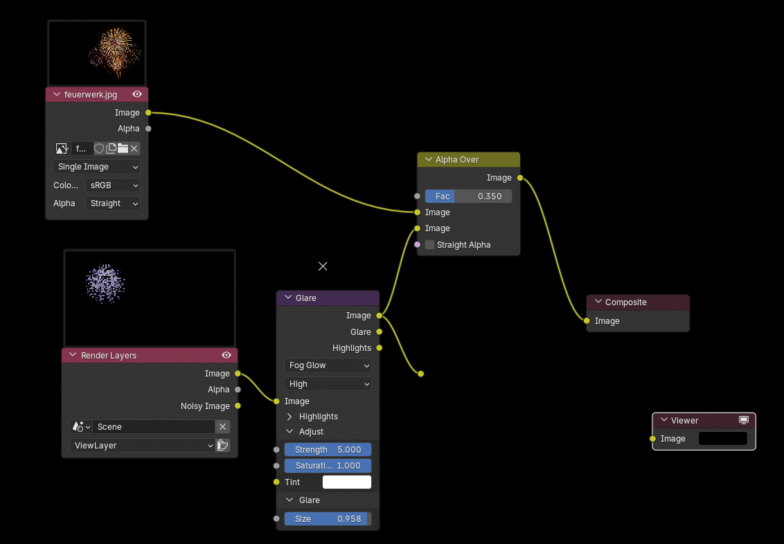Feuerwerk mit alpha kanal - Klaus - 07.10.2025 ich habe in Blender 4.5 ein Feuerwerk mit Partikel Systemen erstellt und mit Emission Schader und Fog Glow Effekt im Compositor versehen. Da ich es mit einem realen Feuerwerk kombinieren will, brauche ich den Alpha Kanal dazu. Was in der Rendervorschau gut aussieht, verliert beim Abspeichern an Helligkeit und vor allem die Farben. Der Alpha Effekt ist zwar gegeben, aber ohne leuchtende Farben ist es wertlos. Da die Weiterverarbeitung in Edius X stattfindet, kann ich nur in PNG oder TIFF speichern. RE: Feuerwerk mit alpha kanal - BlenderFan - 07.10.2025 Hi! Was hindert dich daran, das Blender-Feuerwerk als .mp4 Filmdatei zu rendern und dann in Edius zu importieren? Gruß RE: Feuerwerk mit alpha kanal - Klaus - 08.10.2025 Danke für den Tip. Edius X kann Mpeg-4/H2.64, Mpeg-4/Mpeg-4(divx) und Mpeg-2 nicht öffnen. ich hatte cuh shcon quicktime versucht, aber das war ohne alpha. gruß RE: Feuerwerk mit alpha kanal - BlenderFan - 08.10.2025 (08.10.2025, 02:58 PM)Klaus schrieb: Edius X kann Mpeg-4/H2.64, Mpeg-4/Mpeg-4(divx) und Mpeg-2 nicht öffnen... Ehrlich? Was ist das für ein Video-Schnitt Programm? (oder nur die Test-Version?) Ganz doofe Frage vielleicht... Was ist, wenn du dein Projekt mit dem Blender eigenen Video-Editing machst!? Gruß! RE: Feuerwerk mit alpha kanal - Klaus - 08.10.2025 es ist Edius X pro . da ich mein blender feuerwerk mit einem video von einem realen feuerwerk kombinieren will muss ich edius benutzen. Danke RE: Feuerwerk mit alpha kanal - troggel - 08.10.2025 (08.10.2025, 04:37 PM)Klaus schrieb: es ist Edius X pro . da ich mein blender feuerwerk mit einem video von einem realen feuerwerk kombinieren will muss ich edius benutzen. Nein, musst du nicht. Was hindert dich daran dein Realvideo in den Sequencer zu laden? Dann kannst du auch den Compositor und, wenn deine Kamera sich bewegt, Camera tracking nutzen. RE: Feuerwerk mit alpha kanal - Klaus - 09.10.2025 muss ich nicht mein Feuerwerk erst zum clip rendern lassen, um es mit dem Realvideo zu kombinieren? Dann hätte ich ja dasselbe Problem: Verlust an Leuchtkraft und Farbe. RE: Feuerwerk mit alpha kanal - troggel - 09.10.2025 Ich hab dir mal einen Test gerendert. Einmal der reine Renderoutput und einmal mit Hintergrundbild im Compositor mittels Alpha Over Node kombiniert. Ob du als Hintergrund eine Bitmap oder eine Videosequenz (Image Sequence) benutzt, ist dem Compositor egal. RE: Feuerwerk mit alpha kanal - Klaus - 10.10.2025 Vielen Dank. Das scheint der richtige Weg zu sein. Ich habe statt eines Einzelbildes als Hintergrund eine .mov Sequenz vom realen Feuerwerk mit der richtigen Framezahl eingefügt. Beim Rendern der Animation ist leider Blender nach dem 3. Frame abgestürzt. Im Ergebnis ist aber offensichtlich nur das erste Bild des movies als Hintergrund gerendert. Außerdem würde ich gerne das Eingangssignals des Hintergrundes etwas abschwächen. RE: Feuerwerk mit alpha kanal - TripTilt - 11.10.2025 probier das nochmal, genau so ist es gedacht, dass man das macht