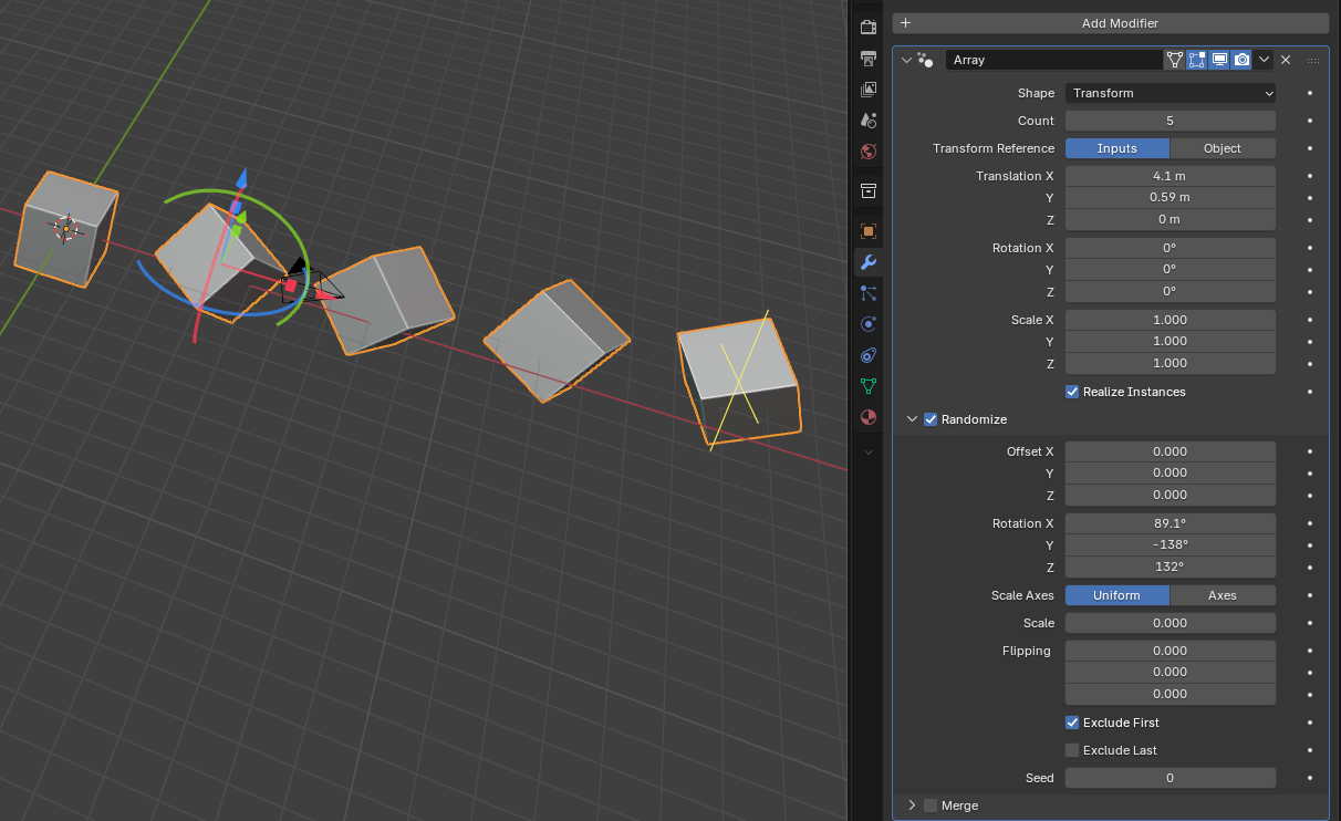 Array mit rotation - Tester1980 - 19.12.2025 Guten Tag, gibt es in Blender eine Möglichkeit einen Arraymodifireähnlichen Modifire anzuwenden der jedes einzelne der vermehrten Objekte unterschiedliche rotieren lässt. Also so das kein eindeutiges Muster zusehen ist. RE: Array mit rotation - troggel - 20.12.2025 Der neue Arraymodifier (Blender 5.0) hat eine randomize Funktion. |