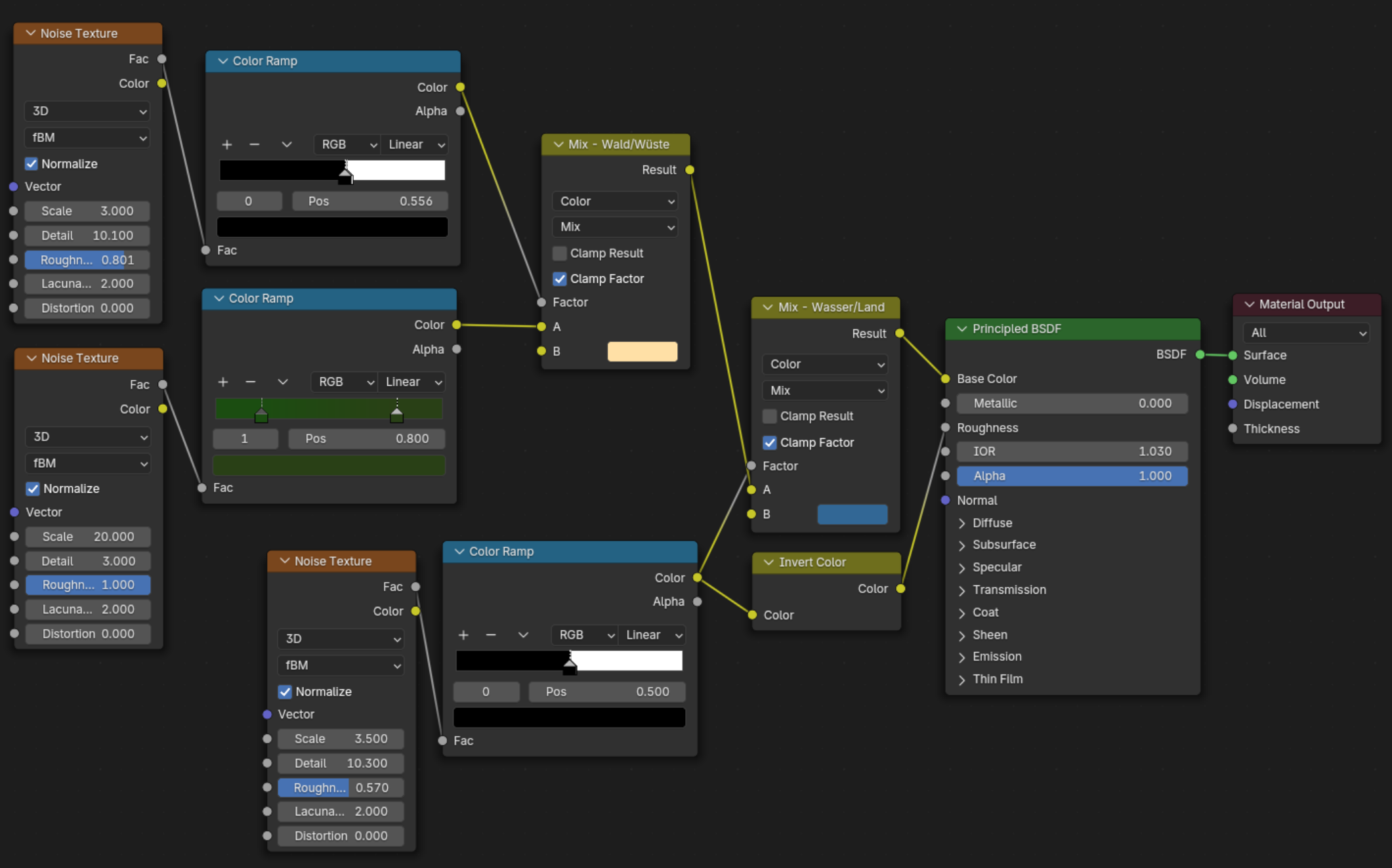 RE: März 2025: Planetensystem - Ephraim - 05.03.2025 Vielen Dank für die Meldung, ist korrigiert. ![]() LG, Ephraim. RE: März 2025: Planetensystem - admin - 05.04.2025 Es gab bei diesem Wettbewerb eine Einsendung, von mir selbst: Planetensystem von Epraim: RE: März 2025: Planetensystem - Mikorsky.S.92 - 10.04.2025 Wow, so wär ich mit meinen Planeten vollstens zufrieden! Schade dass ich kein Bild hinbekommen habe diesmal. RE: März 2025: Planetensystem - Ephraim - 10.04.2025 Danke. Für die Atmosphäre habe ich dieses Tutorial genutzt und den Shader deutlich vereinfacht – das war hier so detailreich nicht nötig: Die Planetenoberfläche ist eine simple Kombination aus Noise und Mix Nodes: Hoffe, du kannst davon etwas mitnehmen. ![]() LG, Ephraim. RE: März 2025: Planetensystem - Mikorsky.S.92 - 11.04.2025 Jo, die Oberfläche ist das mit simpelste am Planeten. Genau so in etwa habe ich meine auch gemacht. |