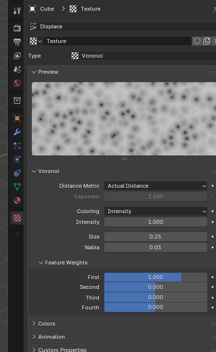 Auf ein Objekt, das als STL-Datei vorliegt, möchte ich eine Voronoi-Textur aufbringen und wieder als STL exportieren. Die Idee ist, im 3D-Druck einen Hammerschlag-Effekt gleich mitzudrucken. Mit Hilfe von Google, ChatGPT und Grok bin ich immerhin schon so weit gekommen, dass ich eine passende Textur erzeugen und im "Material Preview" sehen kann -- Screenshot hängt hier an.