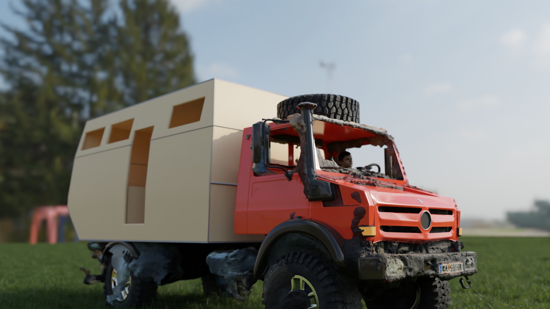 Dieses Mal habe ich keinen Plan benutzt, sondern den Unimog von meinem Bruder abfotografiert und mit der Software Agisoft Metashape, mit Photogrammetrie zunächst als 3D Modell erstellt. Jetzt Retopologie und dann die Szene bauen, wo ich es einbauen möchte. Es soll voller Action sein.
