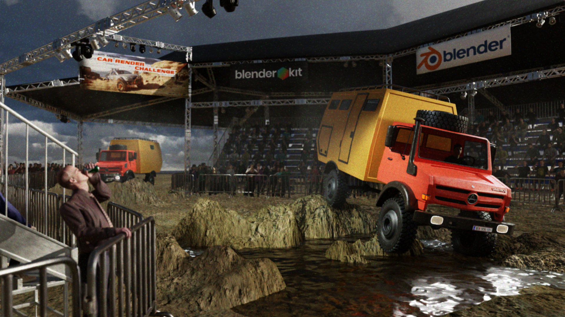 Die Menschen sind mit dem Addon "Population - Crowd Simulation" eingefügt worden. Eigentlich ist die Challenge ja nur das Auto. Die Tribüne hätte ich auch nicht selber modelliert, wenn ich eine gefundene hätte