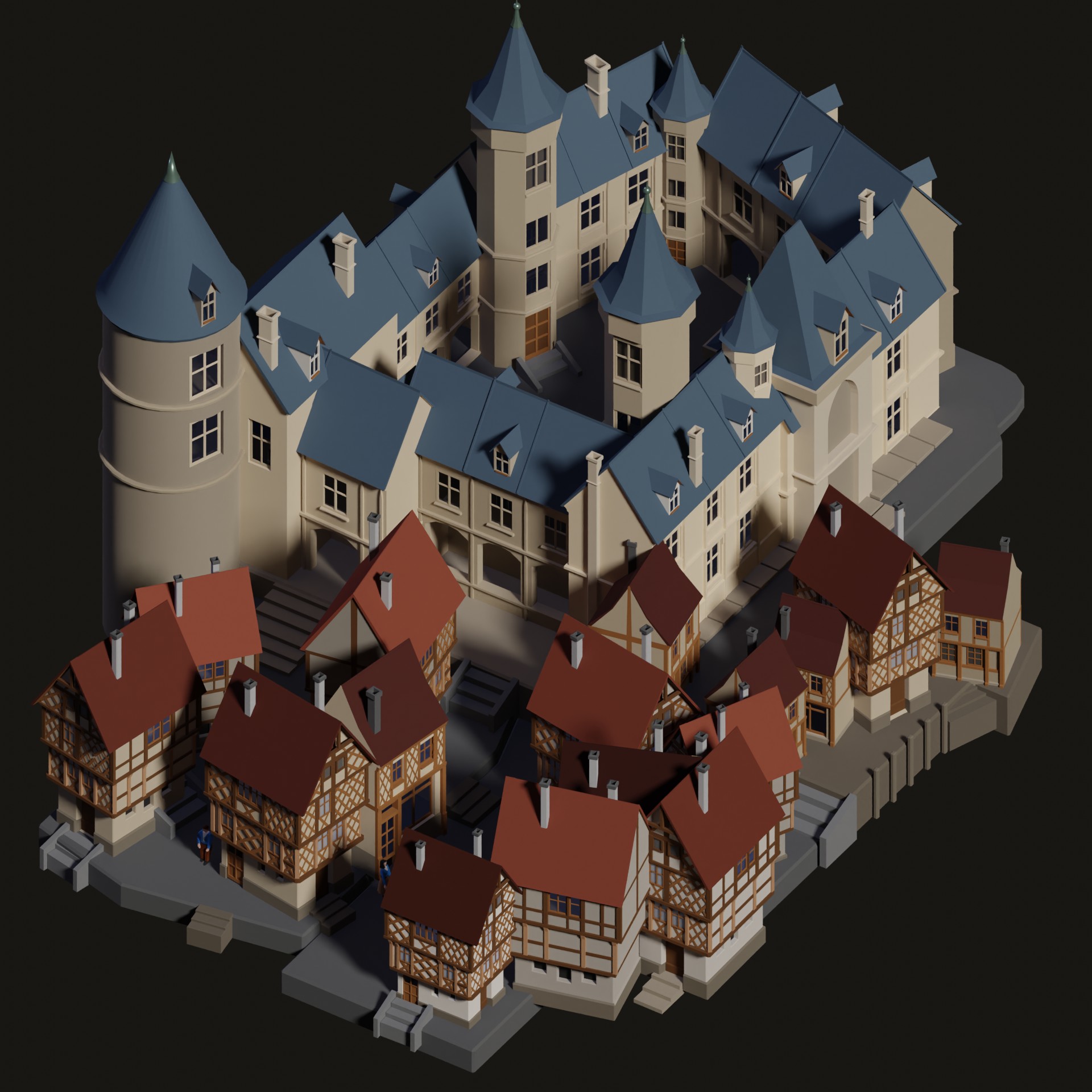 Hier ein zweites Stadtbeispiel für den Einsatz von Fabas Nodes (Instances auf Planes). Vorbild ist ein französisches Stadtschloss (Palais Jaques Coeur in Bourges) in Kontrast zu mittelalterlichen Fachwerkhäusern der Stadt.