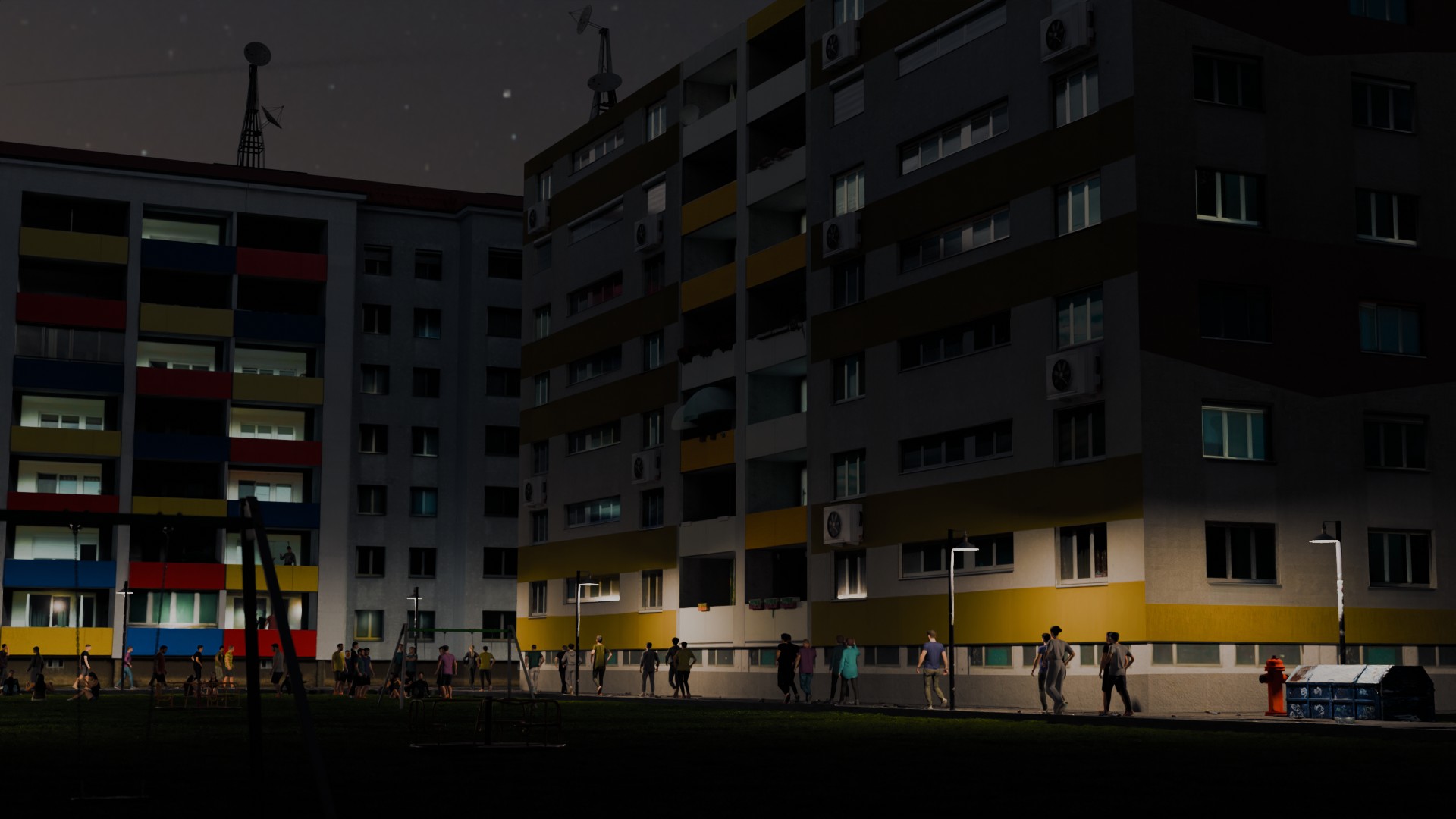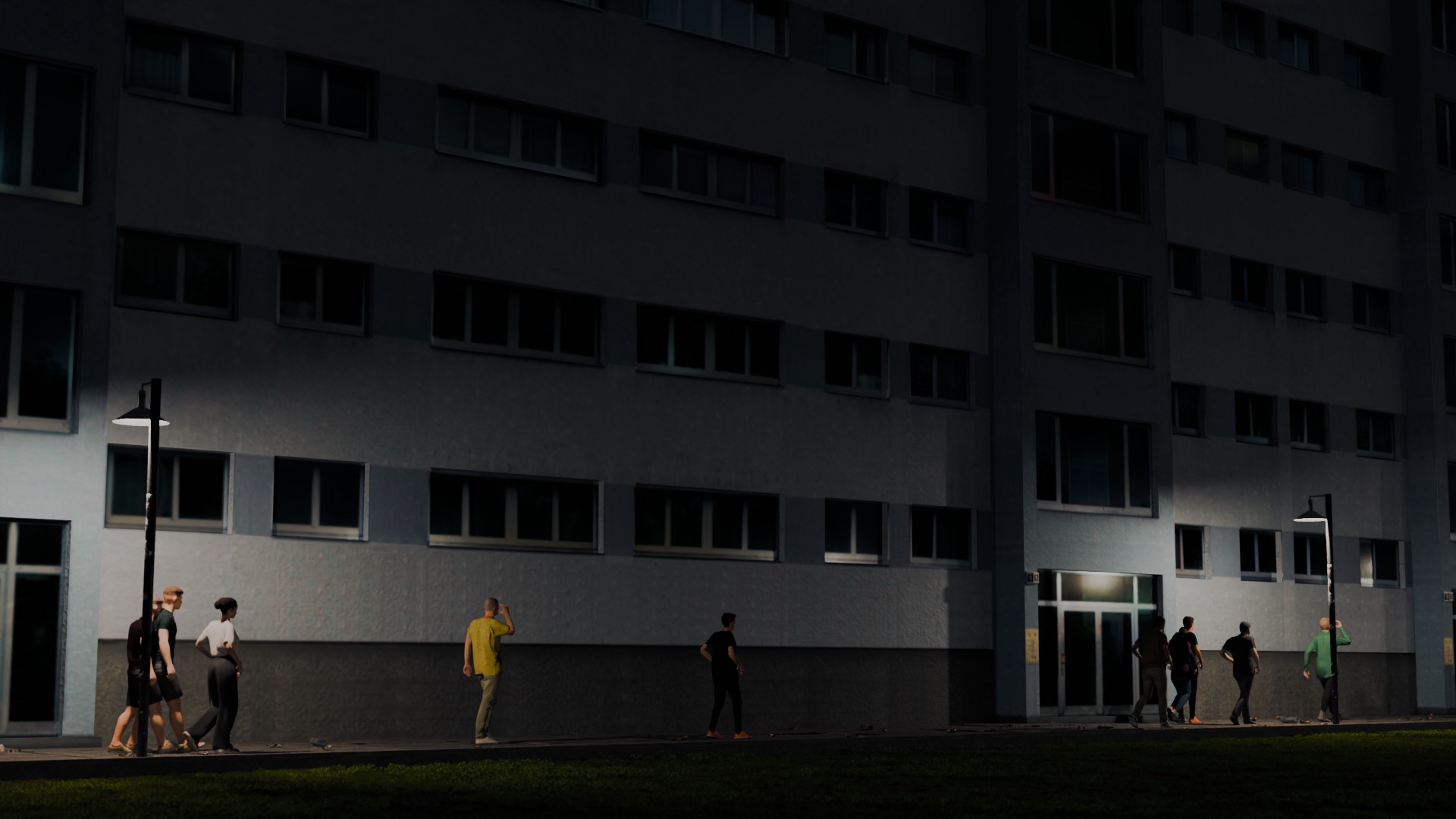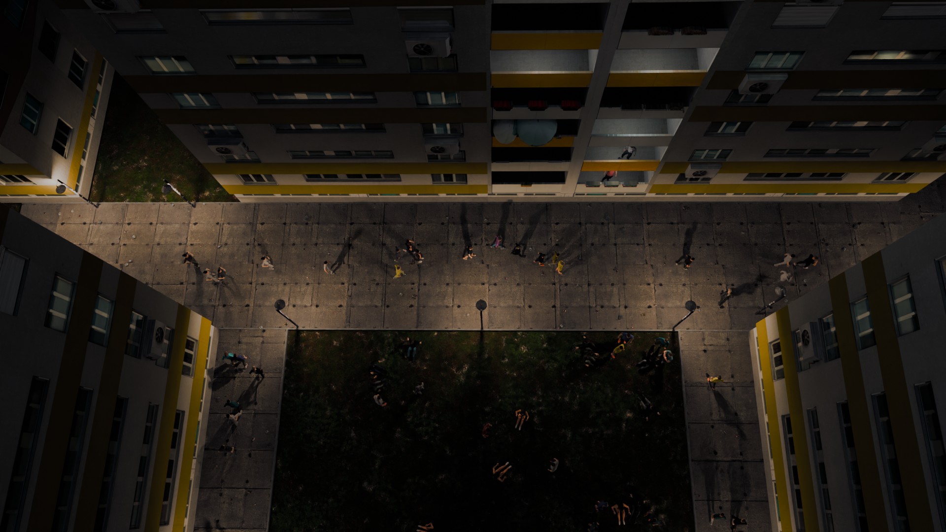 Die Area-Lichter der Fenster bei den Häusern zeigen jetzt nach innen. Zusätzlich wurden Point-Lights in den Balkonen hinzugefügt. An den Seiten des Gebäudes gibt es unter den Fenstern keine Schatten mehr in der Textur.