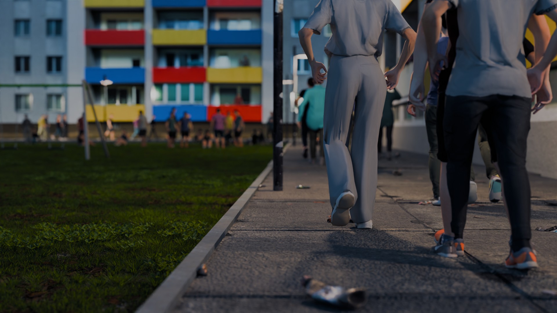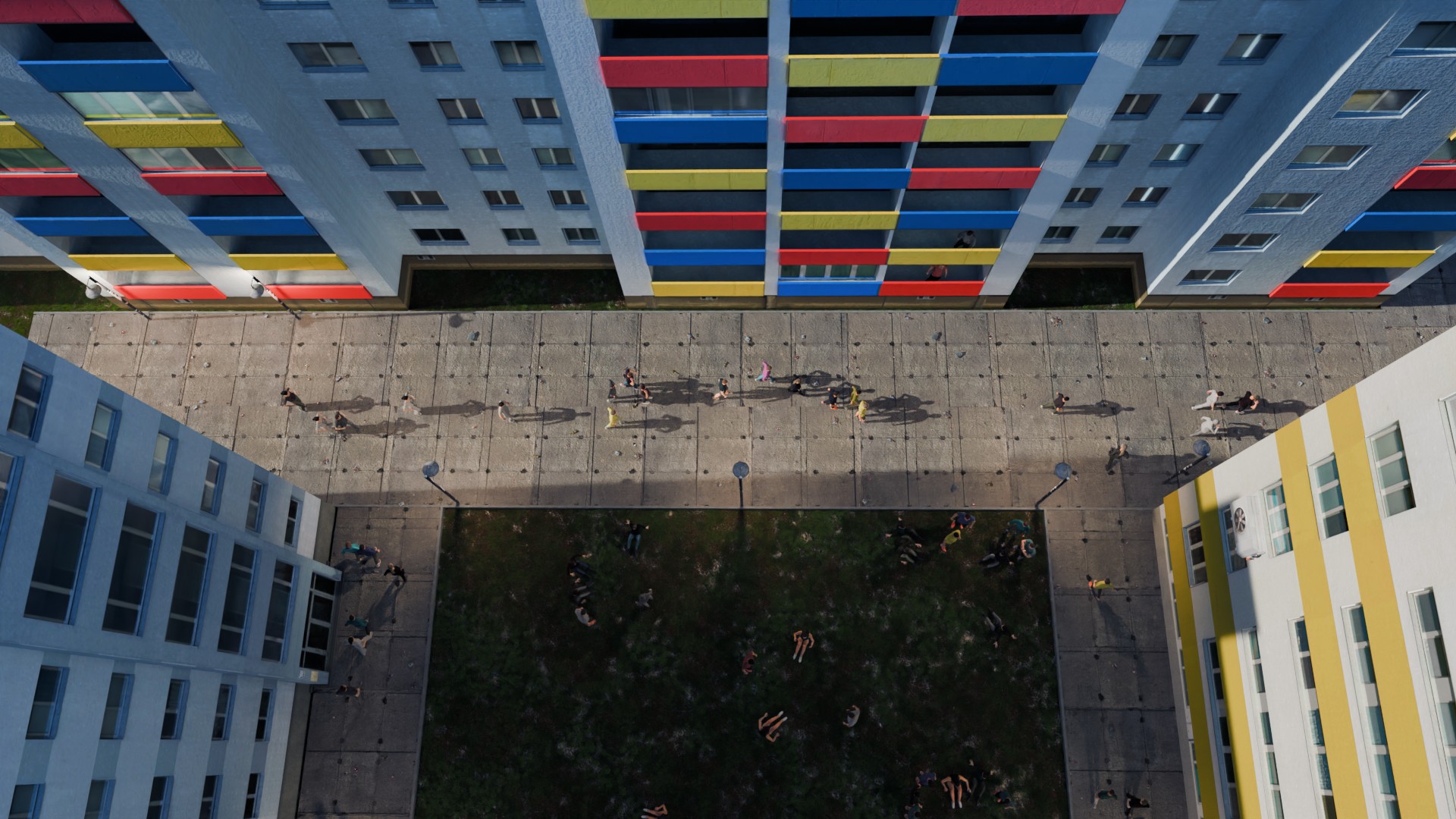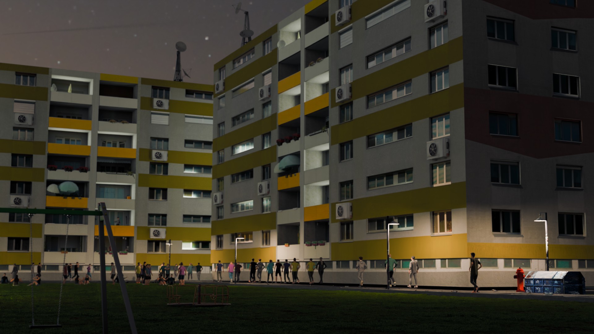 Die Area-Lichter der Fenster bei den Häusern zeigen jetzt nach innen. Zusätzlich wurden Point-Lights in den Balkonen hinzugefügt. An den Seiten des Gebäudes gibt es unter den Fenstern keine Schatten mehr in der Textur.