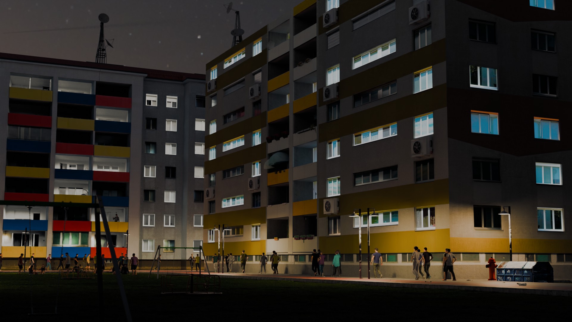 Die Area-Lichter der Fenster bei den Häusern zeigen jetzt nach innen. Zusätzlich wurden Point-Lights in den Balkonen hinzugefügt. An den Seiten des Gebäudes gibt es unter den Fenstern keine Schatten mehr in der Textur.
