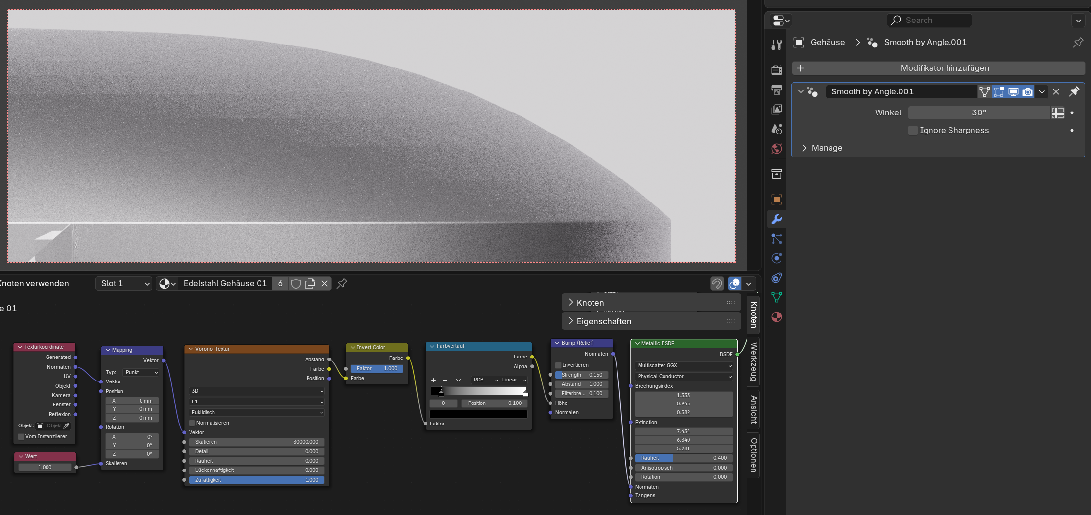 Hier seht ihr eine Gehäuseecke. Das Bauteil wird im Modus "auto smooth" angezeigt.
