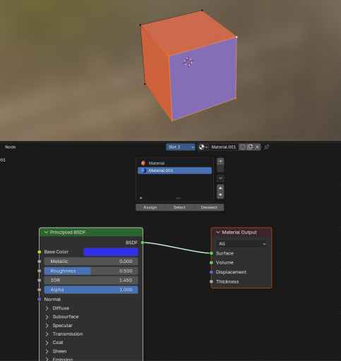 Ein Meshobjekt (der Standartcube). Material von Slot 1 ist rot. Das vordere Face wurde dem Slot 2 zugewiesen (im Editmode markiert und über Assign zugewiesen). Material von Slot 2 ist blau.