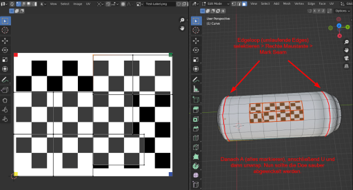 RE: Rundum-Projektion mittels »Schrumpfen/Umhüllen«? - No twist - 06.05.2024 (06.05.2024, 08:53 PM)No twist schrieb: Warum wird das Bild auch auf solche Bereiche des Körpers projiziert, die gar nicht per Edges-Selektion und Seam-Mark ausgewählt worden sind? Das Problem taucht übrigens auch in deinem Video auf, @Chaoswolf . Was tust du, wenn du nur auf den beiden ausgewählten Flächen des Quaders irgendein Bild sehen willst, auf allen anderen aber keines? RE: Rundum-Projektion mittels »Schrumpfen/Umhüllen«? - Chaoswolf - 07.05.2024 (06.05.2024, 10:30 PM)No twist schrieb:(06.05.2024, 08:53 PM)No twist schrieb: Warum wird das Bild auch auf solche Bereiche des Körpers projiziert, die gar nicht per Edges-Selektion und Seam-Mark ausgewählt worden sind? Die Seams markieren lediglich die Stellen an denen getrennt wird. Stell dir vor du willst deine Dose flach auf den Boden abwickeln. Dann brauchst du drei Schnitte. Zwei oben und unten um den Deckel und den Boden abzutrennen und einen Längs um die Dose flach zu drücken. Ich weise den Flächen einfach ein anderes Material zu, welches dann keine Textur hat, oder eben eine für Alumminium. |