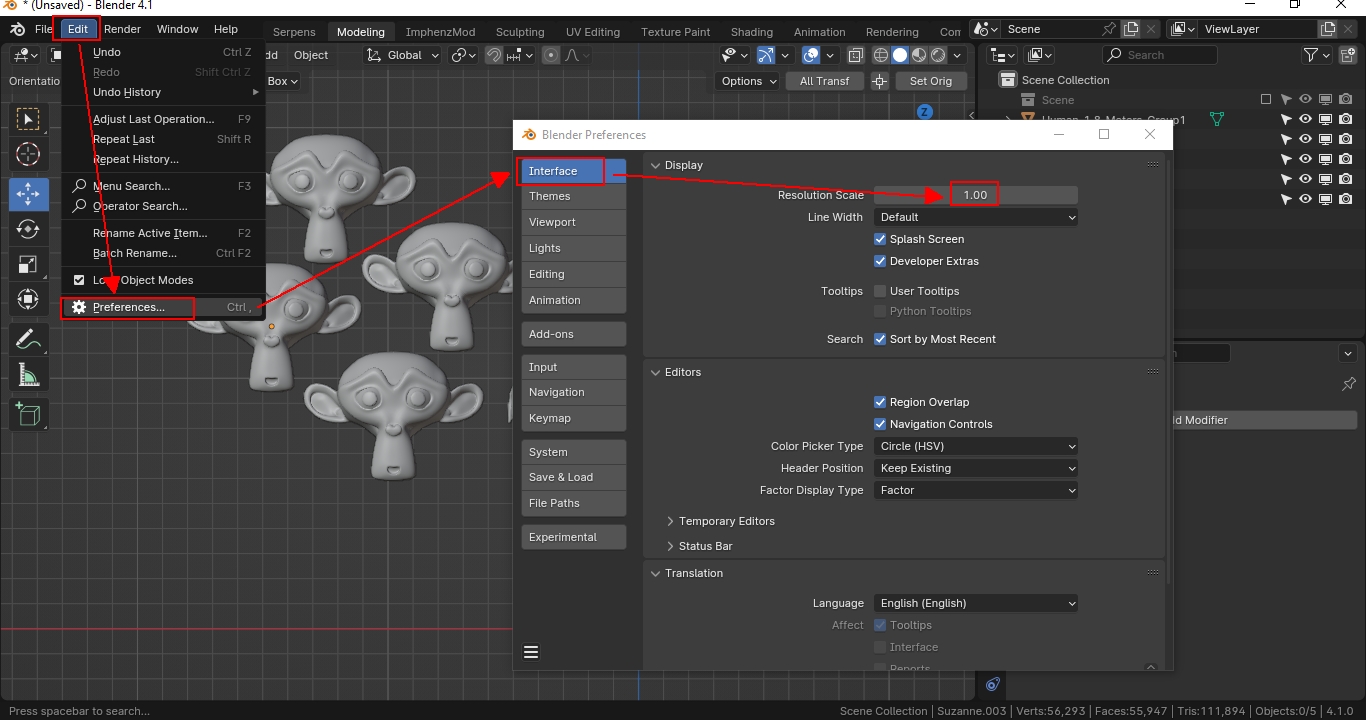 Anfrage GUI Vergrößern - Maik Thor - 09.06.2024 Einen schönen Tag euch allen. Ich bin der Maik und bin neu mit Blender. Ich habe ein Problem, ich müsste in Blender die GUI Vergrößern um damit auf meinen Rießen Bildschirm überhaupt vernünftig Blender zu erlernen. Ich wäre um jede Hilfe sehr Dankbar. Mit Freundlichen Grüßen: Maik Thor RE: Anfrage GUI Vergrößern - BlenderFan - 10.06.2024 Hi! Ja du kannst die Größe des UI in den Preferences einstellen: Edit/Preferences/Interface/Resolution Scale Gruß! |