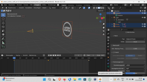RE: Rendern - JM Visuals - 27.10.2024 Hm wie bekomme ich das "Bild" unten in die Leiste. Beim test hab iches einfach hineingezogen, jetzt versuch ich es neu zu machen und es geht nicht? Da das Logo aus zwei Bildern besteht die sich dann gegengleich drehen, dachte ich, ich mach das von Anfang an. auch wegen lernzwecke. RE: Rendern - Ephraim - 27.10.2024 Achso, das besteht nicht nur aus einem Bild? Dann wird es natürlich etwas komplizierter. Evtl. ist es am einfachsten, zwei Planes zu nutzen und dann die Planes mit der Textur drauf zu rotieren, könnte allerdings zu Artefakten führen. Es sind aber schon einzelne Bilder und keine Videodaten, richtig? Wenn doch müsstest du das beim Node mit angeben, dann geht er auch damit um. Wenn du mehrere Bilder in einem haben willst, musst du mit Mix Nodes und alles arbeiten, das machst es dann ein bisschen komplizierter (vor allem, wenn du das dann auch noch animieren willst). Deine Frage habe ich aber nicht ganz verstanden? Meinst du wie man den Image Node erstellt? Das wäre Shift+A → Texture → Image Texture, bzw. einfach im Add Menü (Shift+A) danach suchen. LG, Ephraim. RE: Rendern - JM Visuals - 27.10.2024 JA 2 Bilder (2 .svg). mein erster Plan war Bilder rein, gegengleich drehen fertig. Jetzt : Plane 1 rein, Bild "Ringe" drauf, Material vergeben (ich will erstmal nur glatt reinweiß) Plane 2 rein, Bild "Schrift" drauf, gleich wie bei Plane1 Dann animieren (sprich gegengleich drehen lassen) rendern Video draus machen fertig. Dann kann ich es als Visual einsetzten. Das ist mein Plan. Ist mein Gedankengang richtig und durchführbar oder muss was geändert werden? Zur Frage: Dar braune Fenster IMG... bekomme ich jetzt nicht in die Leiste. Bein Test gestern habe ich das Bild in der Leiste rechts angeklicht und in die Leiste gezogen. Bei drn "Ringen" funktioniert diese vorgehensweise nicht! Deswegen meine Frage: Was mache ich falsch? Wie bekomme ich im Screenshoot braune Img... Fläche in die Leiste? Ich habe alle Flächen nir geht nur die Img... Fläche ab um des Screenstoot zu vollenden. Hoffe ich hab jetzt alles gut genug erklährt. RE: Rendern - Ephraim - 27.10.2024 Achso, das sind SVGs? Sag das doch gleich, da kannst du dir den Aufwand nämlich sparen. Du kannst SVGs einfach über das Menü File → Import → Scalable Vector Graphics einfügen, dann hast du die Bilder als Kurven in der Szene. Oft sind die zwar noch zu klein, aber das lässt sich ja schnell ändern. Hoffe, das klappt. LG, Ephtaim.