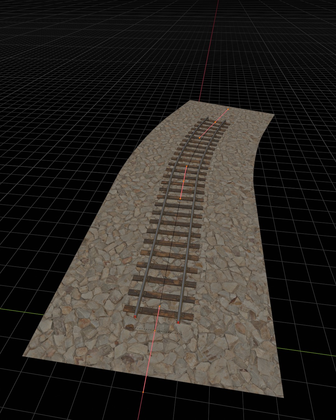 Nur beim Gleisbett bin ich noch am Tüfteln: Momentan ist das Schottermaterial nur auf eine stark unterteilte Plane mit Displacement projiziert. Da will ich mir noch eine bessere Lösung überlegen – vielleicht mit echten Steininstanzen oder Geometry Nodes.