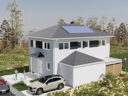 Vielen Dank für deine ich habe dies mit dem HRI Himmel glaube ich irgendwie verstanden. tatsächlich möchte ich Bilder machen in der Art wie hier beigefügt, also Bilder die zukünftigen Bauherren schon mal einen Eindruck ihres neuen Gebäudes machen. Also etwas Realismus kann nicht schaden, bei mir hängt es meines Erachtens wirklich nur nur noch am Himmel, der ist etwas traurig. ich habe jetzt versuchsweise einen sehr blauen Himmel als HDR hinterlegt, leider wird es aber wieder grau, als ob irgendwo ein Filter oder Ähnliches davor geschaltet ist. Vielleicht kann man ja den HDI Himmel nach oben nach unten schieben als Lösung, aber wahrscheinlich hat es einen ganz anderen Grund, den ich nicht nachvollziehen kann. Hoffentlich kannst du mit meiner Aussage etwas anfangen und mir weiter Hilfestellung dazu geben. Danke.