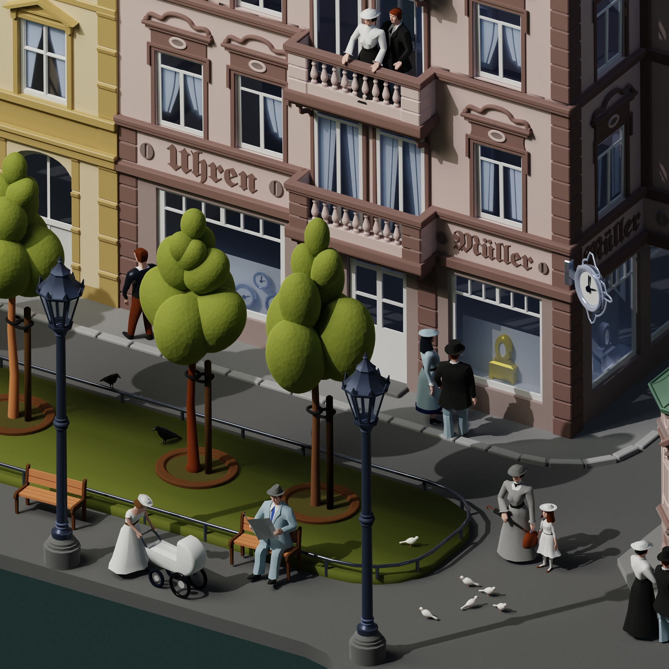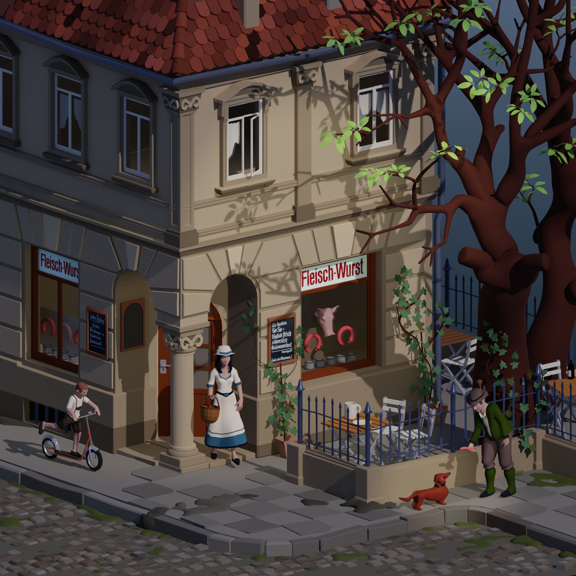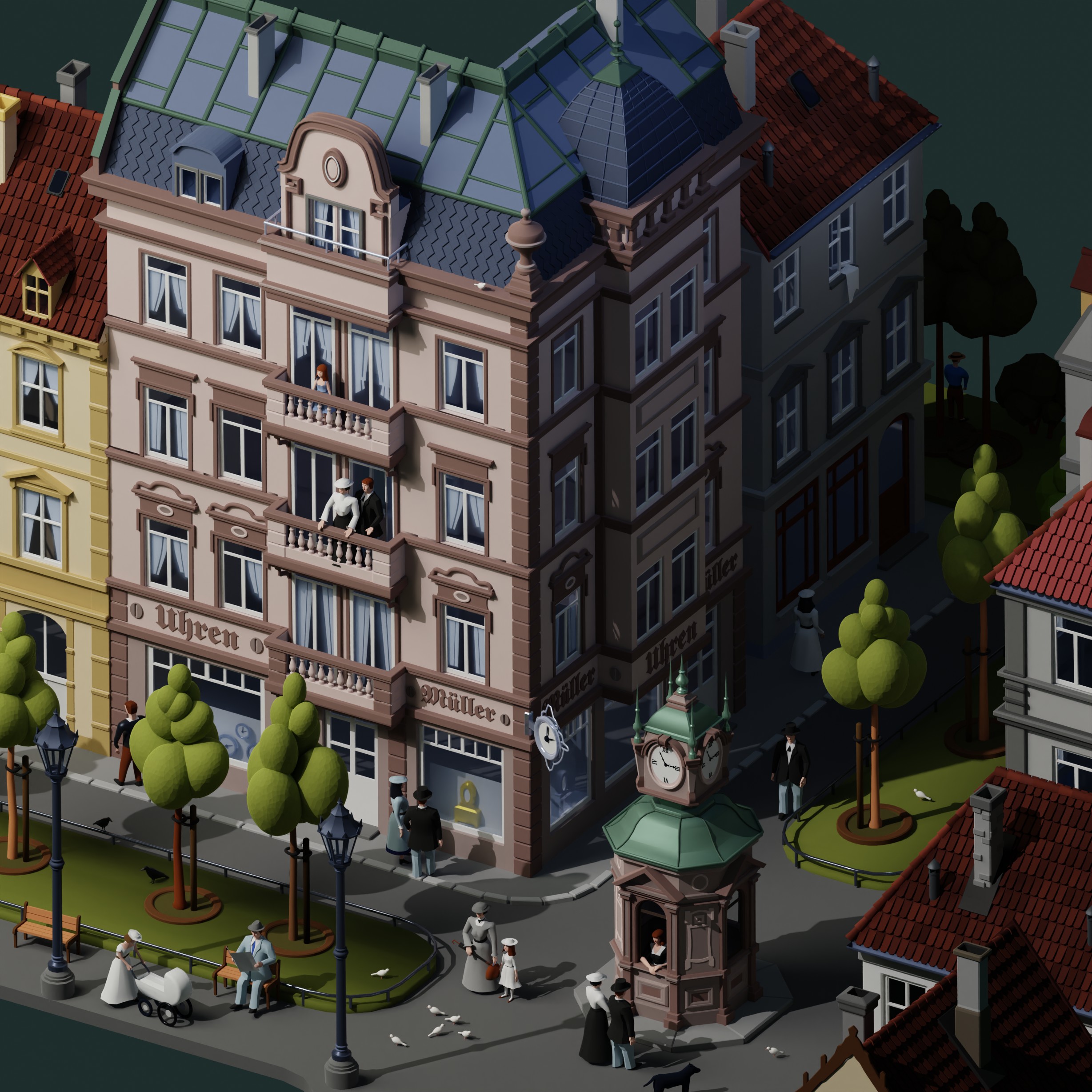 Die Gestaltung der Materialen - Metallbedachung - ist immer etwas heikel. Dreht man die Roughness bei allen auf 0,8 wirkt das Bild insgesamt stumpf. Hat man zu viele Reflexionen, widersprechen die Materialien dem Lowpoly-Stil (zu viel Realismus). So versuche ich einen Mittelweg mit einigen Akzenten.
