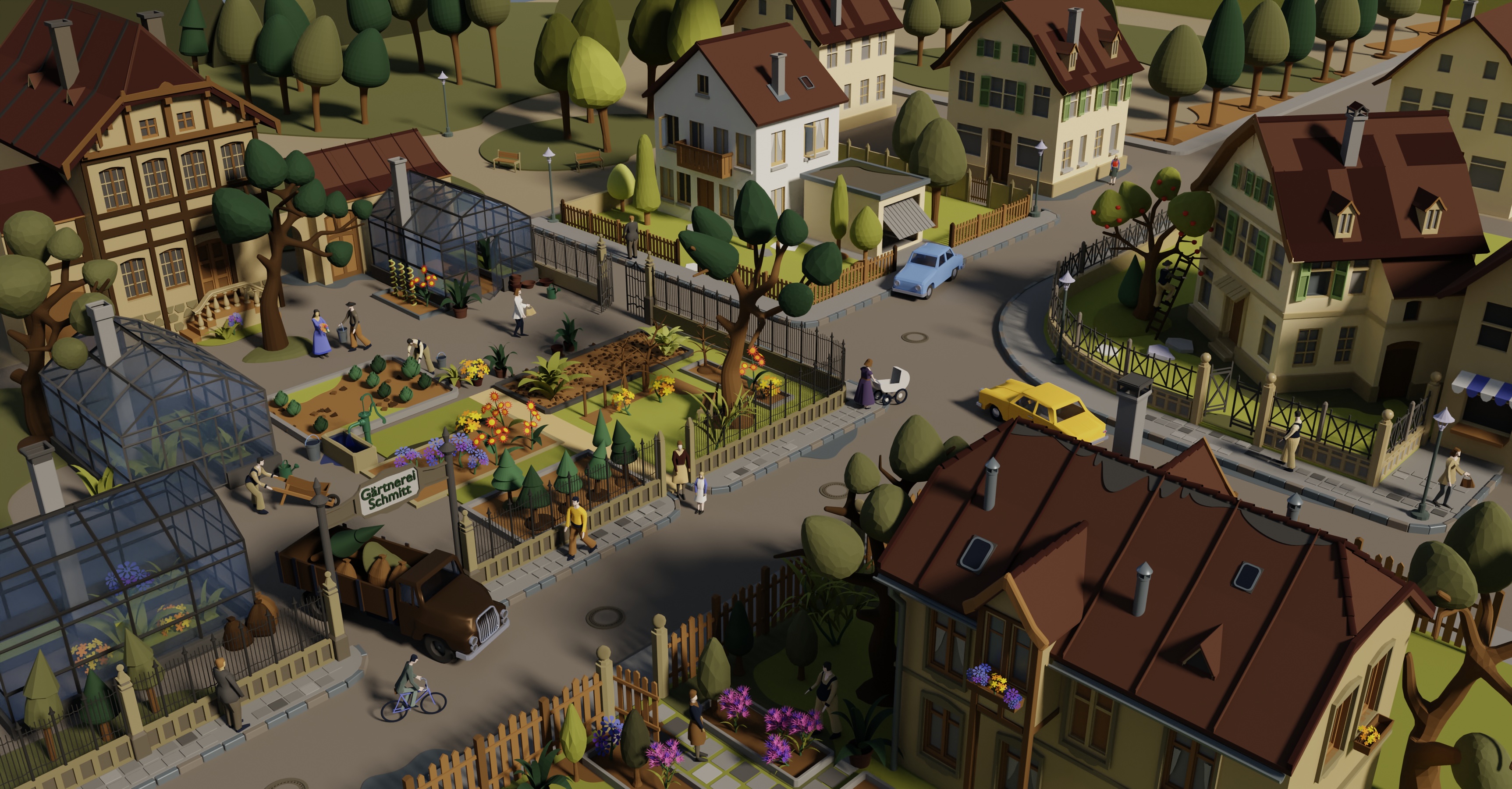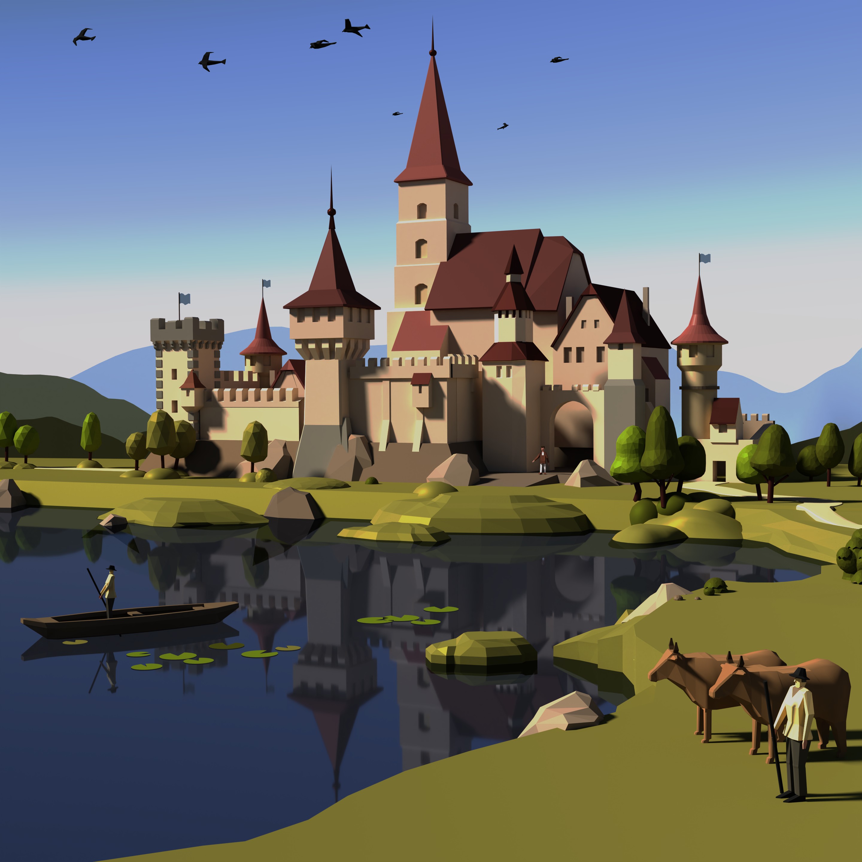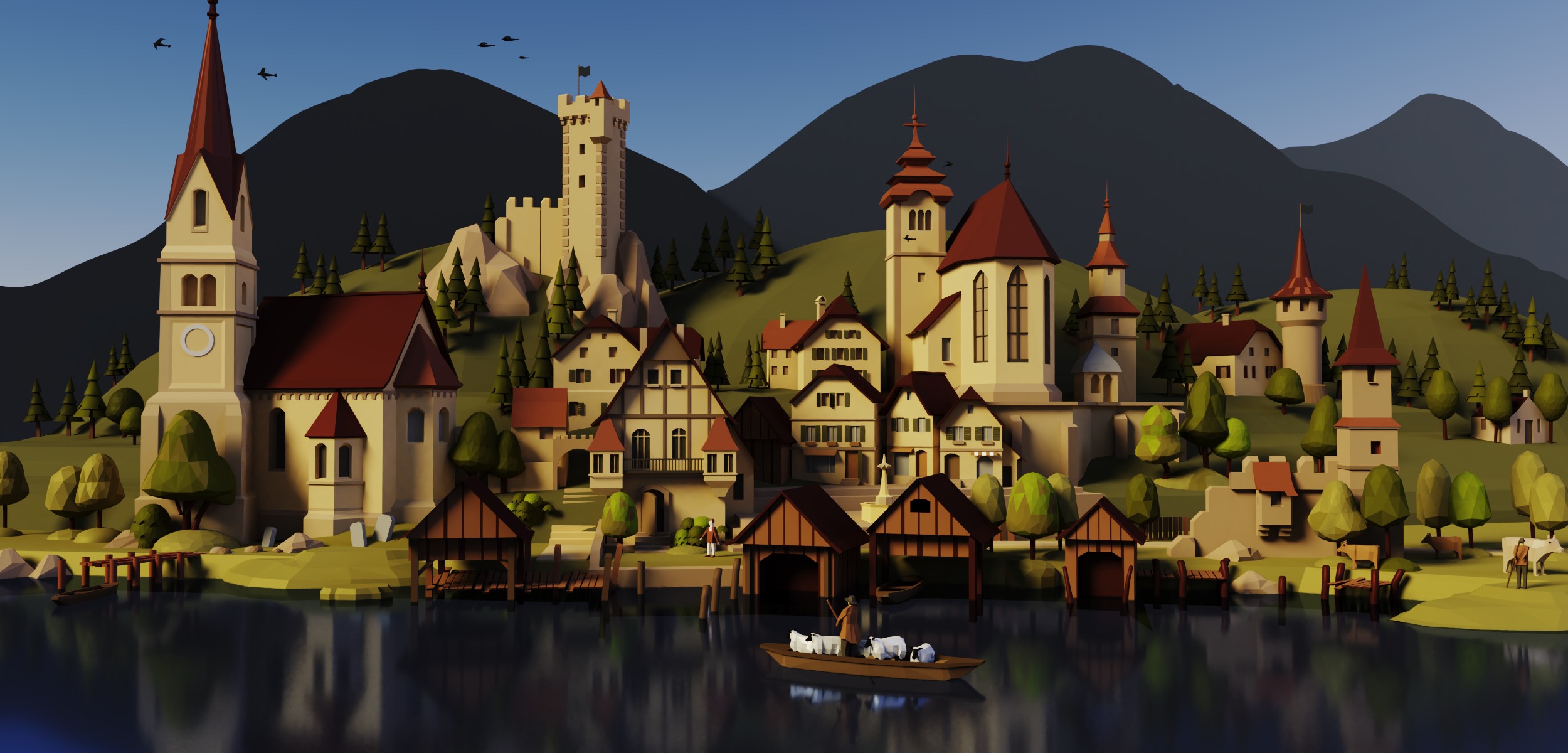 Die Gestaltung der Materialen - Metallbedachung - ist immer etwas heikel. Dreht man die Roughness bei allen auf 0,8 wirkt das Bild insgesamt stumpf. Hat man zu viele Reflexionen, widersprechen die Materialien dem Lowpoly-Stil (zu viel Realismus). So versuche ich einen Mittelweg mit einigen Akzenten.