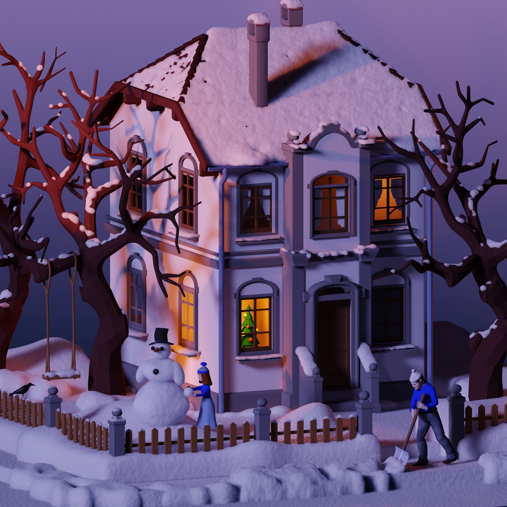 Ich habe das Addon "RealSnow" benutzt, allerdings für die verschiedne Stellen unterschiedliche Werte für Coverage und Height eingestellt und manchmal mit Proporitional Editing nachbearbeitet (überstehendes Schneebrett an der Dachrinne) oder Teile gelöscht (Schneehauben auf dem Zaunlatten).