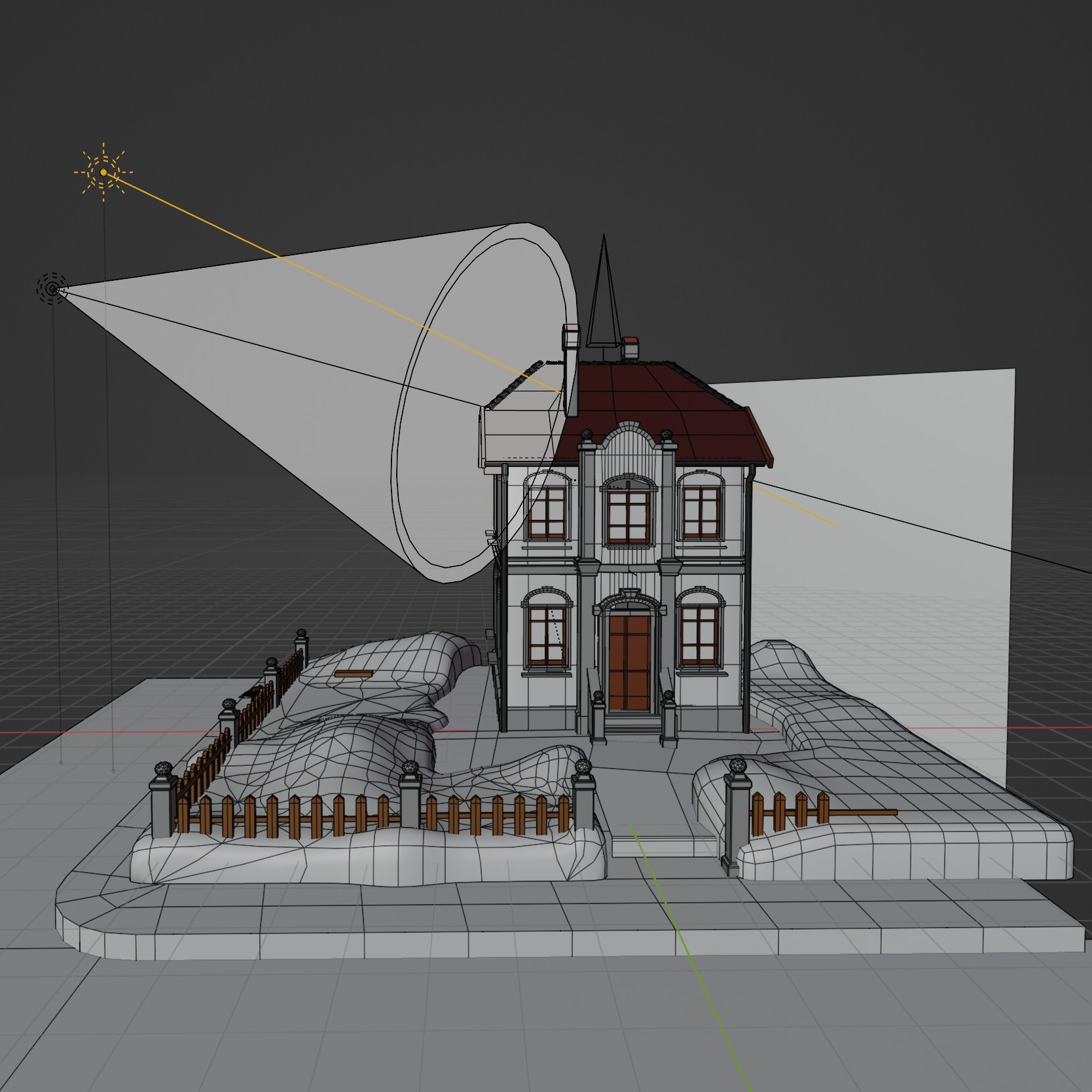 Das bläuliche Licht kommt von einer Sun für die ganze Szene (im Screenshot markiert), die letzten Sonnenstrahlen von einem Spotlight. Das Ganze vor einer Hintergrundplane mit einem Farbverlauf.