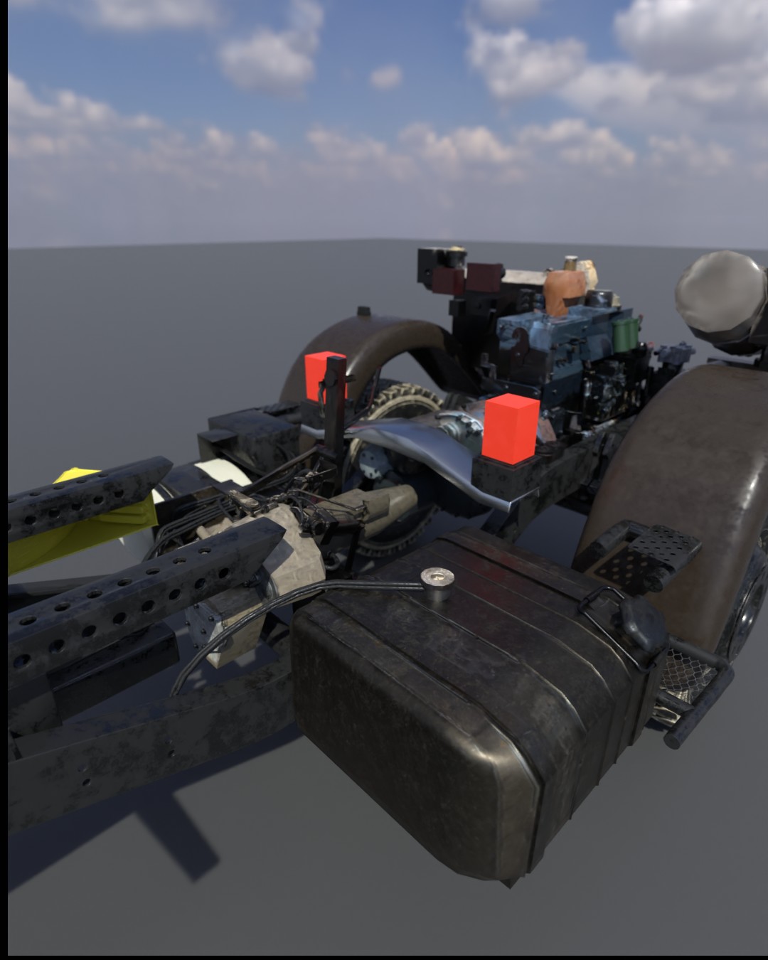 Wir gehen in die nächste Runde! Der Motorblock ist praktisch fertiggestellt, es fehlt nur noch die Roughness Map. Der Tank ist mittlerweile auch als Low-Poly-Modell verfügbar und komplett texturiert. Allerdings hat dieser eine 4K-Textur, die ich für den Innenbereich des Fahrzeugs baken werde, um die Anzahl der verschiedenen Texturen zu reduzieren