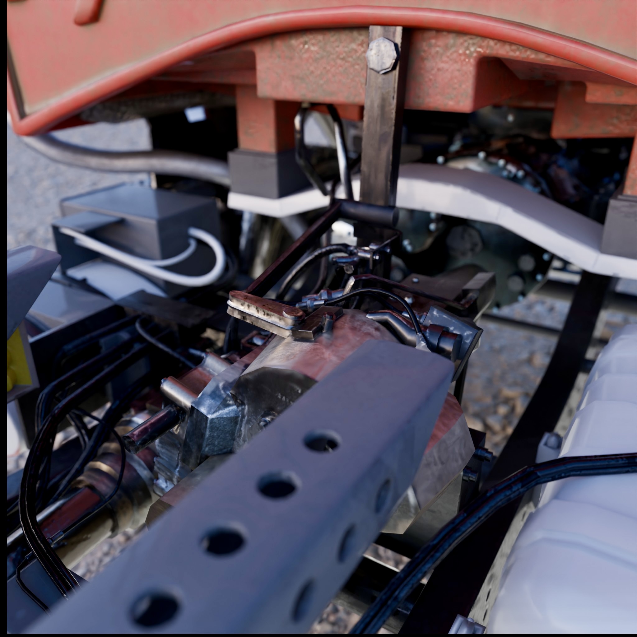 Der Motorabschnitt ist jetzt fertig texturiert. Heute habe ich eine Roughness Map erstellt und zusätzliche Materialien darüber gelegt. Anschließend habe ich die gebackene Textur aufgehellt, da sie sonst zu dunkel war. Jetzt widme ich mich der Fertigstellung der Federung.