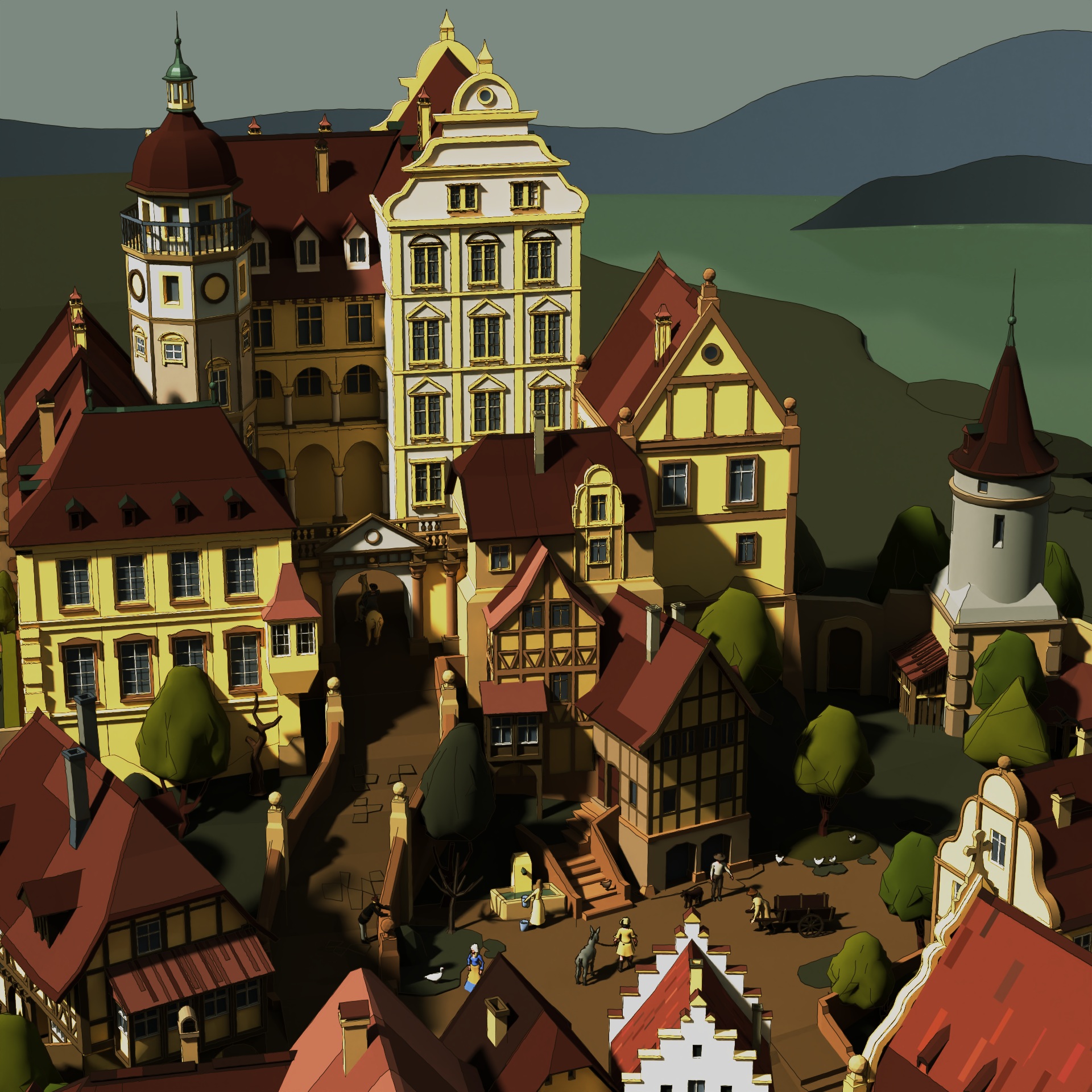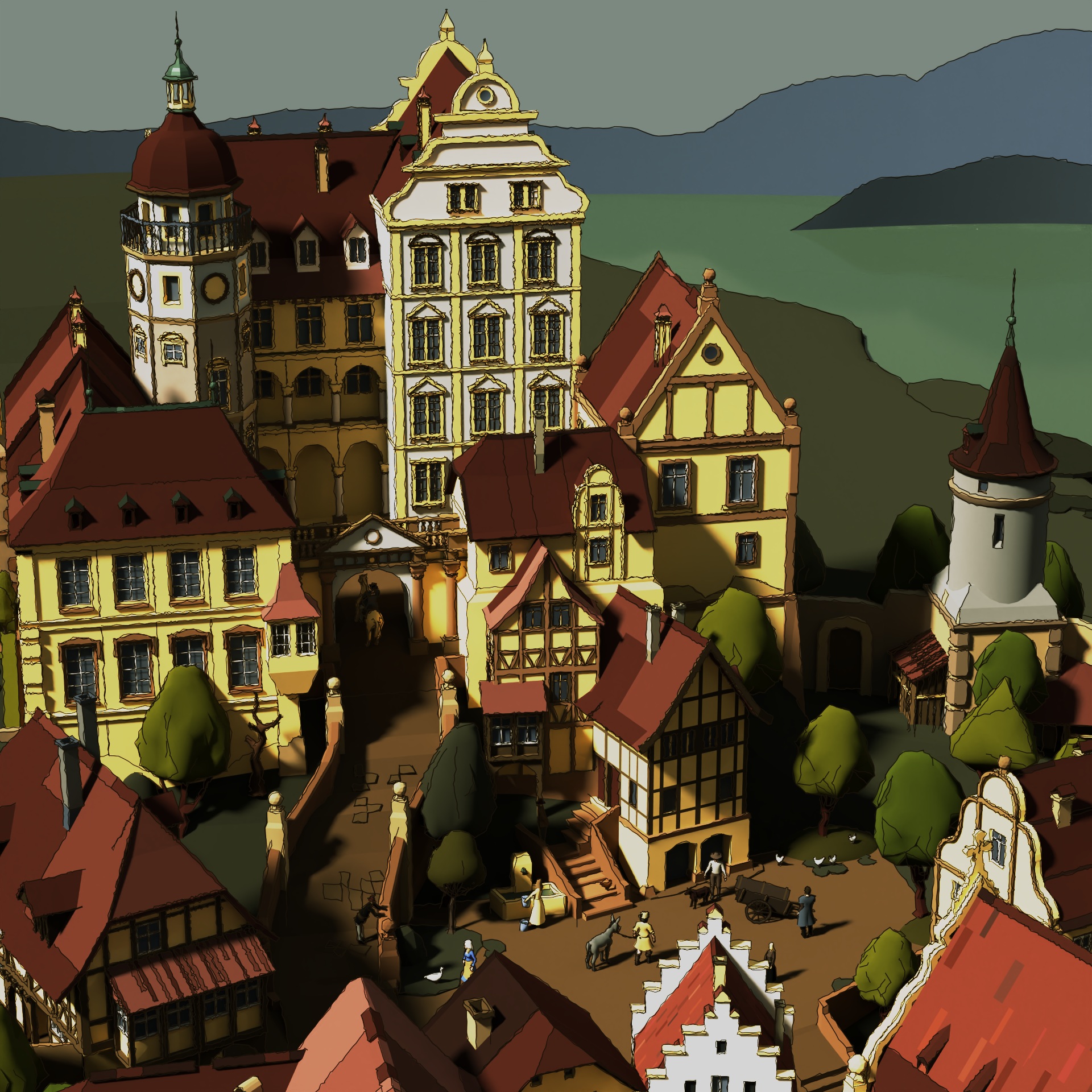 Nanu, wo geht es denn da hin? trifft er sich mit der Person mit dem Pferd? Wenn ja, wo wollen sie hin? Wenn nein, wo will er dann hin? Zur Burg? Was möchte ein (dem aussehen nach zu urteilen) einfacher Bauer mit einem Esel in der Burg? Oder Wohnt er vielleicht einfach an der anderen Seite dieser Stadt?