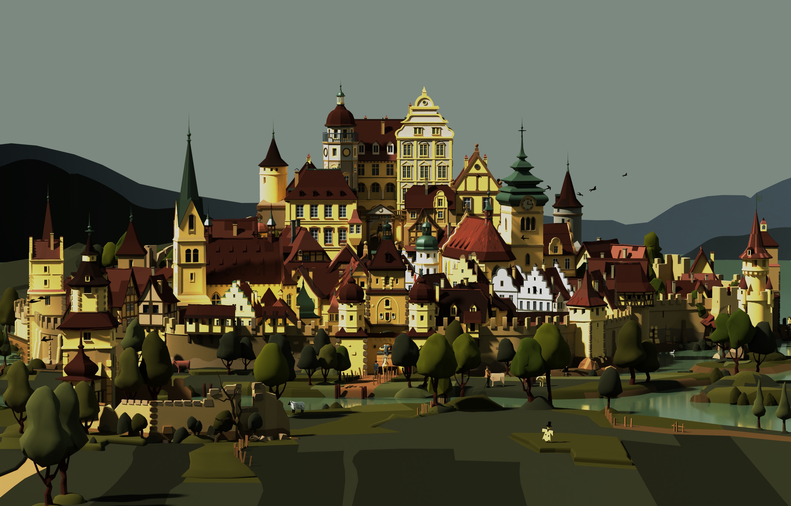 Was mir auffiel war, dass ein paar runde Formen smooth zu sein scheinen (z.B. Turm rechts, Giebel weisses Haus), andere aber nicht (kleine Kuppel Turm links, Kugeln auf der Mauer).