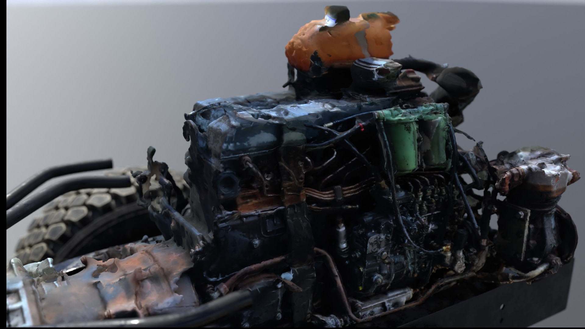 Hierzu habe ich mit dem iPhone Fotos vom Motor gemacht und daraus mithilfe von Photogrammetrie ein 3D-Objekt erstellt. Anschließend habe ich den Motor grob in Low-Poly nachgebaut, um ihn später mit den Daten aus der Photogrammetrie zu verbinden. Das Ergebnis ist jetzt eine 2k Textur mit einer Texel-Dichte von 27 px.