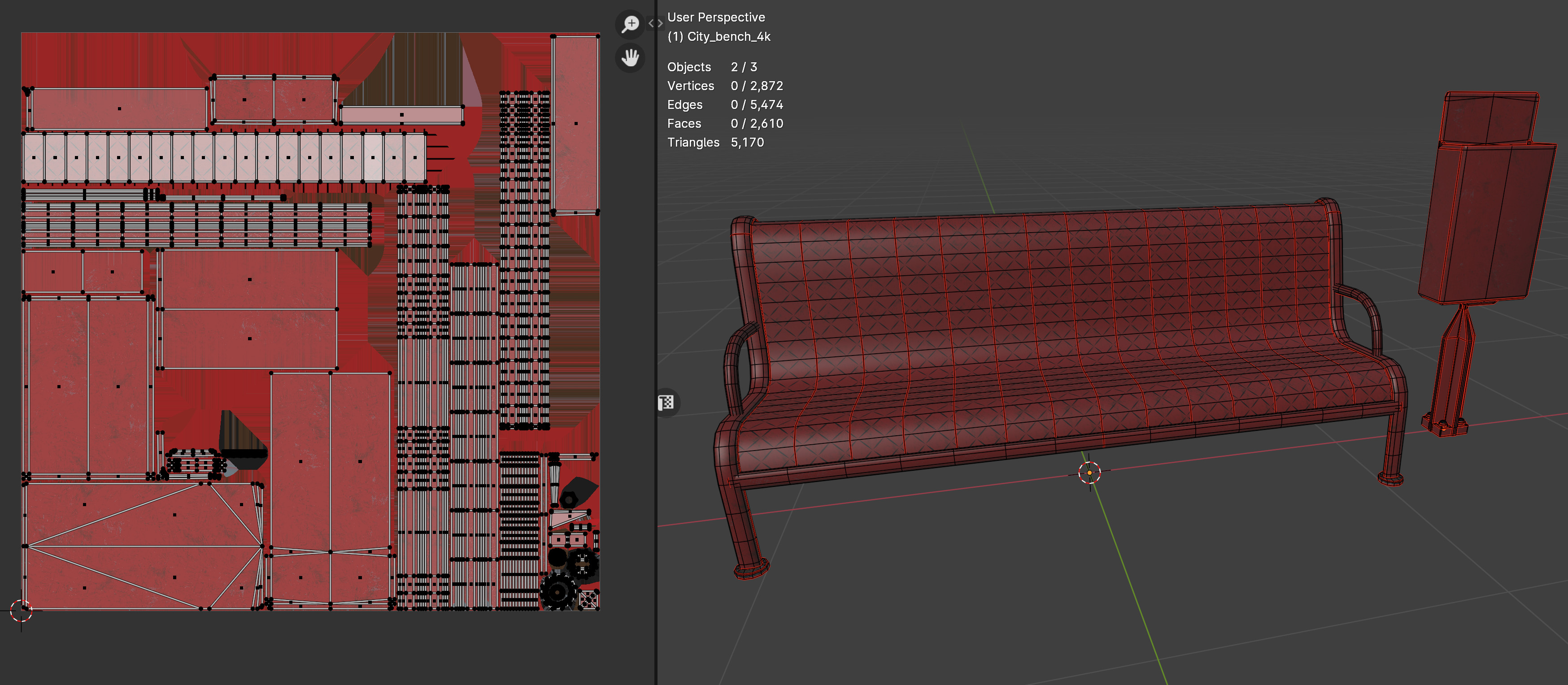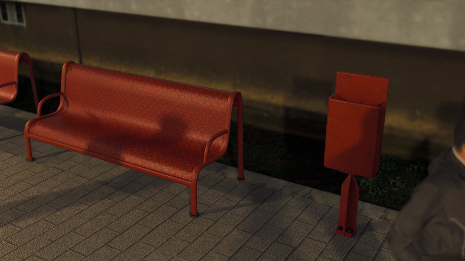 Die Sitzbank und der Mülleimer stammen aus der Unterführung, die in einem hier veröffentlichten Beitrag gezeigt wurde, und wurden weiter bearbeitet. Beide Objekte teilen sich eine (!) 1k-Textur.