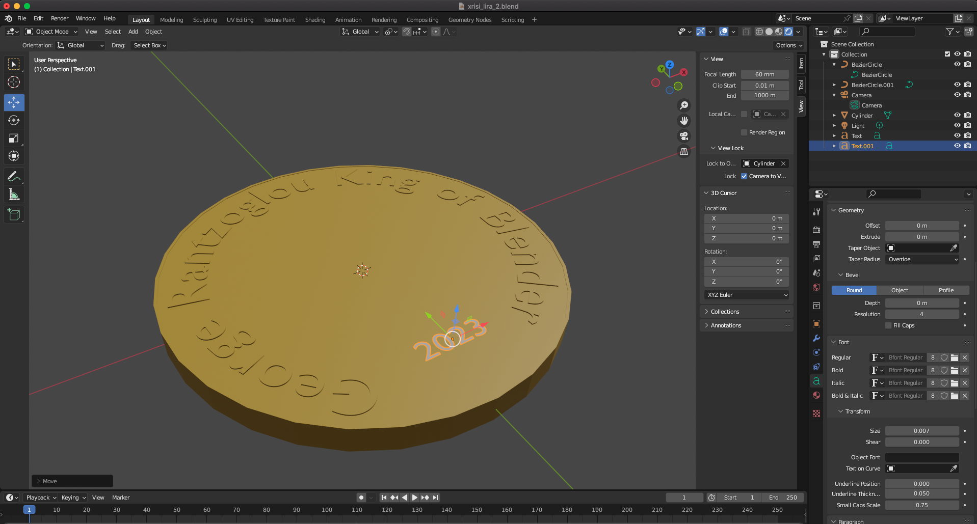 • Zum Abschluss will ich noch folgendes sagen, es schien so als ob nach einigen Objekten (Zylinder, Schrift, Curve's etc.)ich nicht mehr die Möglichkeit zu zoomen hatte. Wohl gemerkt die Abmessungen sind sehr sehr klein. Ich versuchte die in mit einem Mac Book Pro und der Blenderversion 3.4.1  [Version 3.4.1 (3.4.1 2022-12-20)].