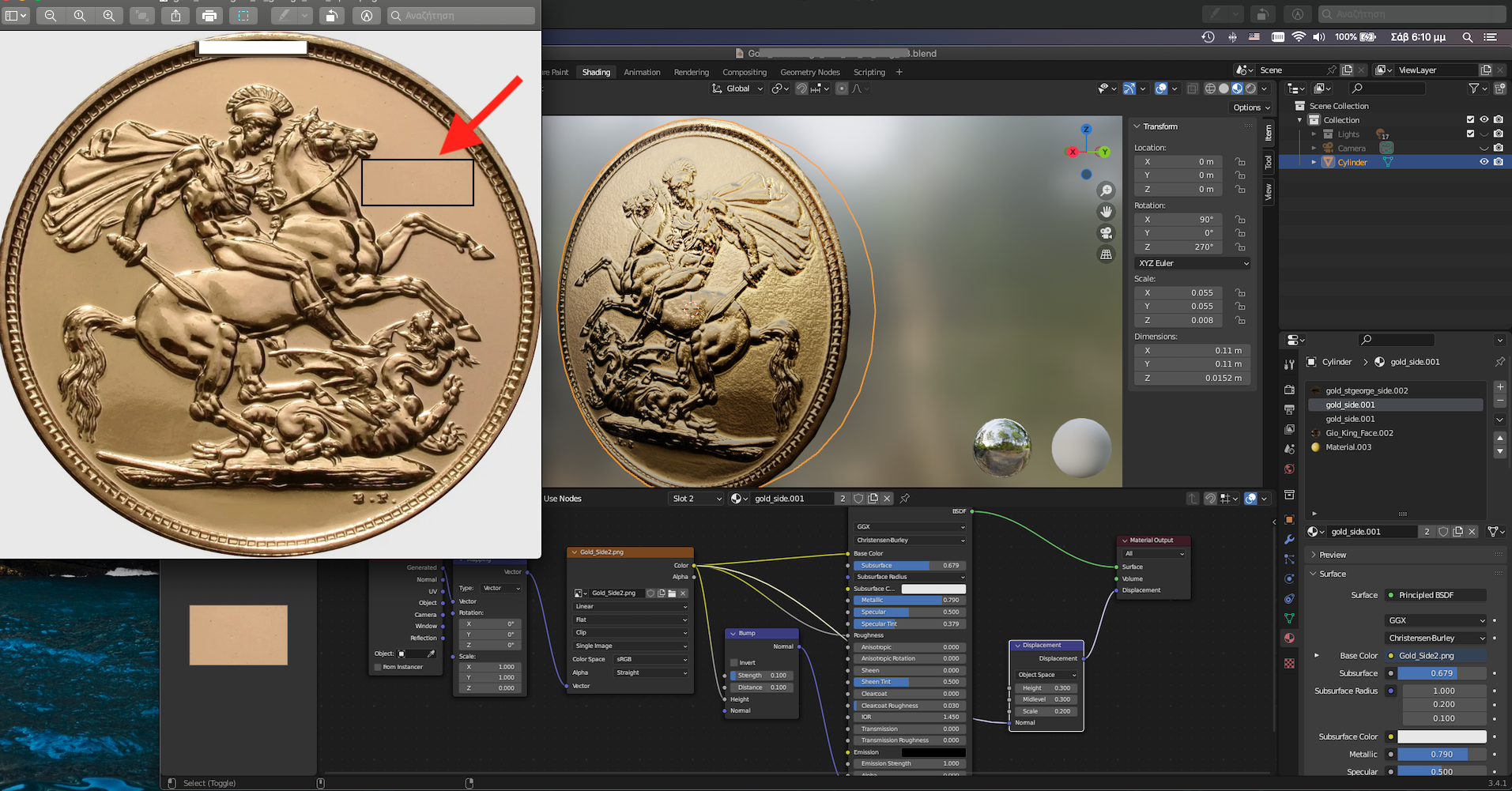 1. Wie man sehen kann, habe ich mich für folgendes entschieden. Die eine Seite der Münze wird der "allgemein bekannte" St.George sein. Diesen habe ich auch im Internet finden können. *Webp-Datei) Allerdings beim Material herstellen und diesen durch Image Texture und Bump auf die eine Seite der Münze zu setzten wird der spiegelverkehrt angezeigt. (Bild1)