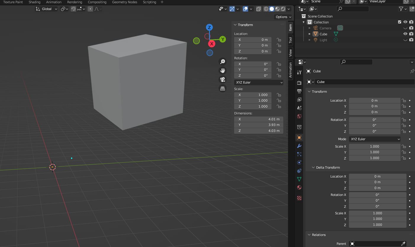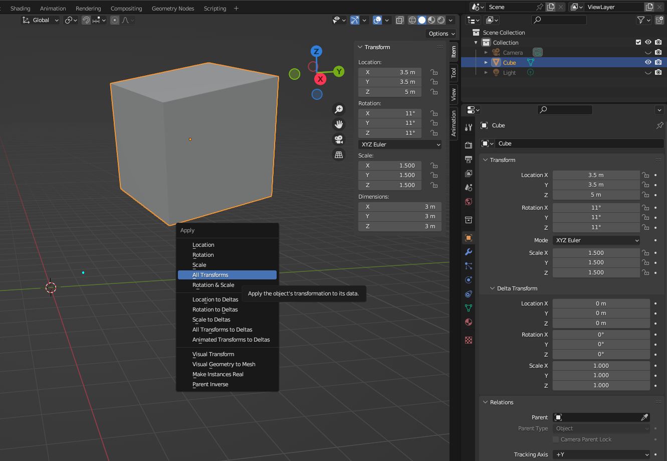 Ursprünglich wurden zu jedem Objekt die globalen Werte zu xyz Koordinaten ( =Location) angezeigt (Bild 1), nach der Transformation alle xyz Koordinaten null (Bild 2). Leider habe ich damals es versäumt, bei der Transformation nur Rotation und Scale anzuwenden. Location hätte ich weglassen müssen.