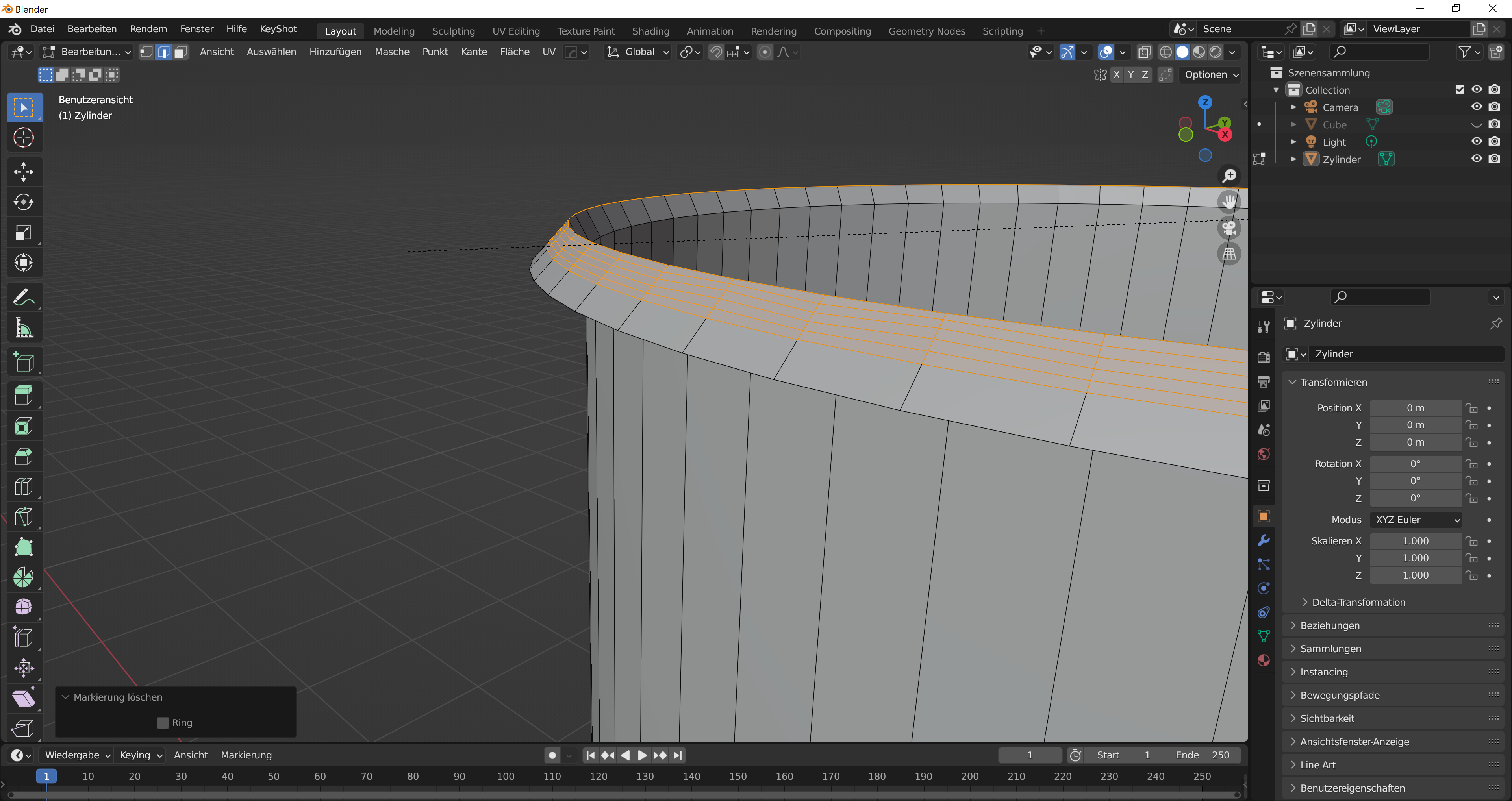 First I need to say, that I ONLY worked in working mode. No transformation of the Basic Cylinder I used to insert to beginn. So I created somthing like a "seam" on the top of the cup. Now there are 3 edge loops I want to bevel. BUT on one of these Edgeloops the bevel segments only affect one side. Like in the picture. I only worked with extrude, scale and move tools directly with the edgeloops. There cannot be any additional geometry. Does anybody know where I got stucked? I work with Blender 3.4.1 at present. I also uploaded the belnder file with the Problem next to a pic with my bevel settings. I Hope yo can help me to bevel this correctly.