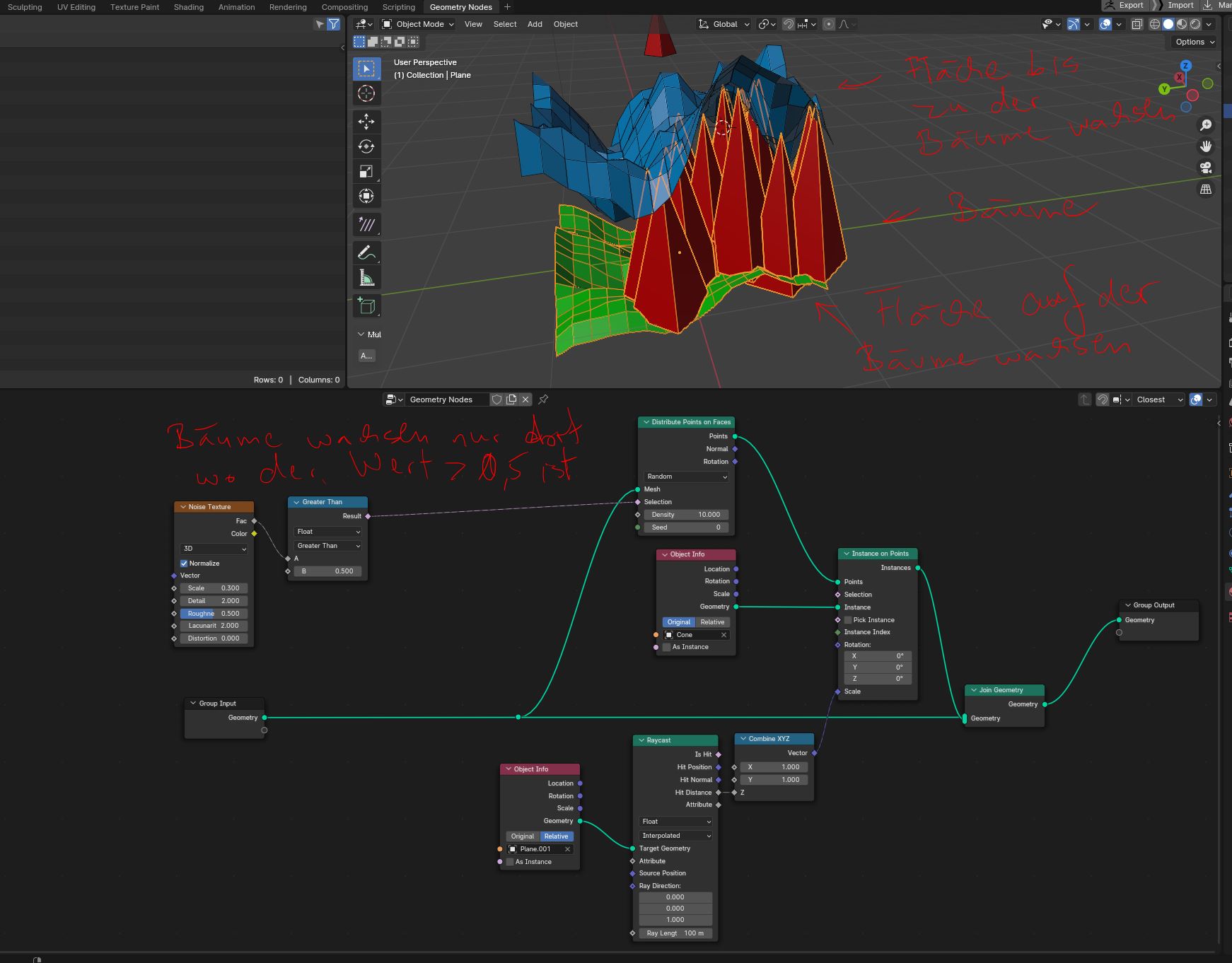 - Auf jeden der Punkte wird ein roter Baum gesetzt mit der Z Skalierung = Entfernung zur blauen Plane