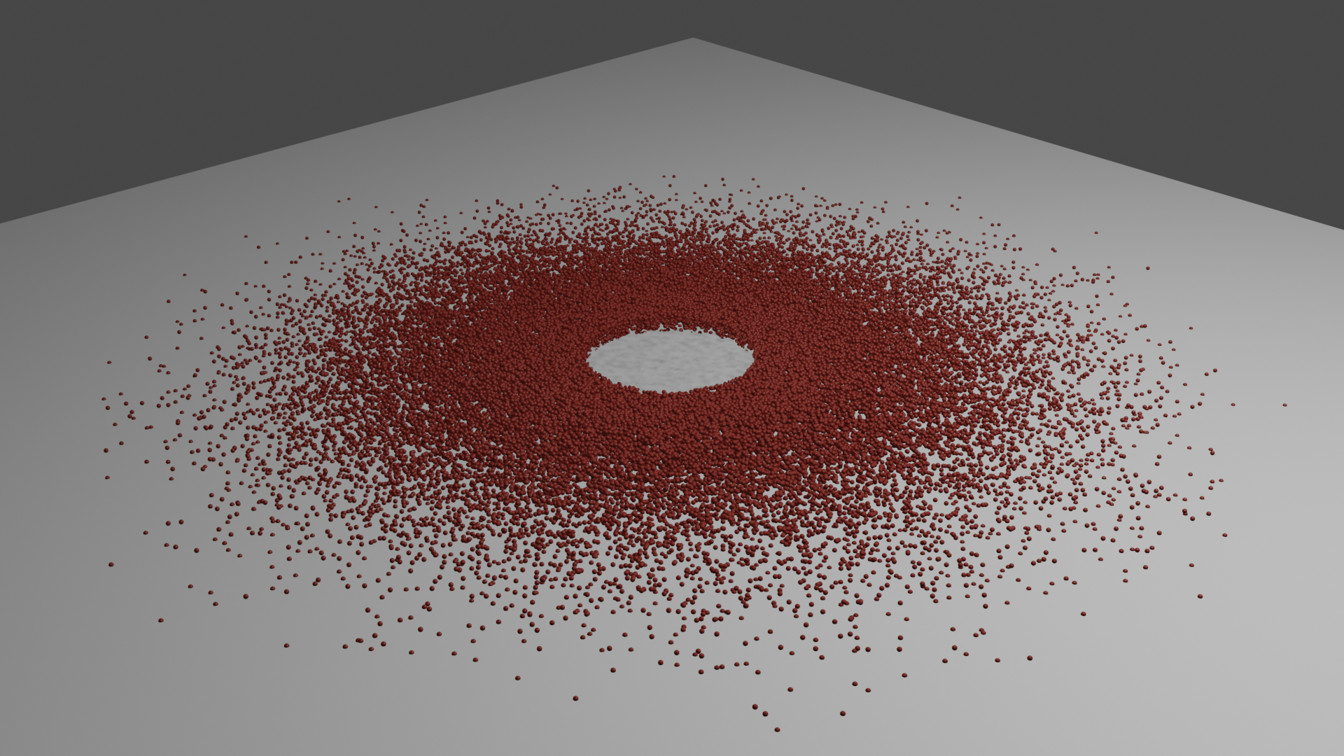 Probleme: Der Schatten der Partikel ist aus irgendeinem Grund noch da. Die Partikel in der Mitte sind mit dem Material ausgeblendet. Bei Eevee ist das nicht sonderlich stark zu sehen, aber bei Cycles ist dann leider alles schwarz. Also noch nicht optimal. Ich hoffe einfach das es ausreicht, wenn nicht melde dich bitte einfach wieder.